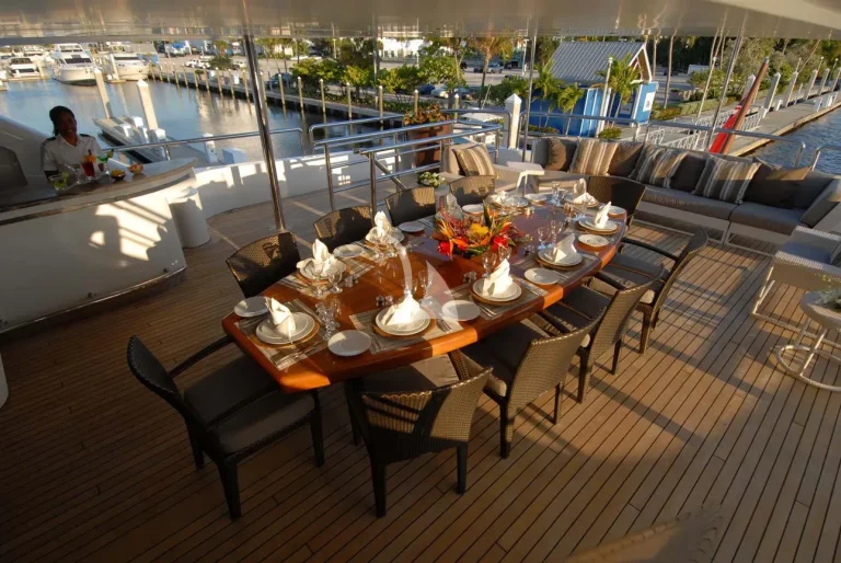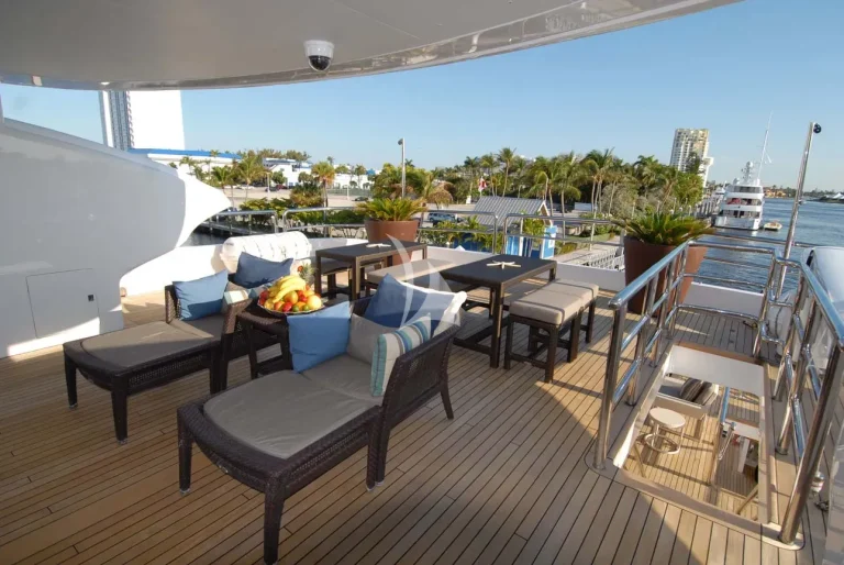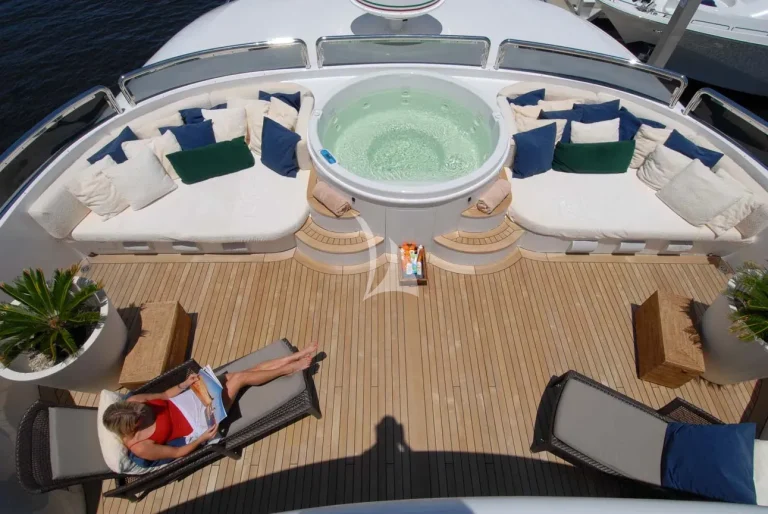 Azteca’s sundeck features a large sun bathing area forward with a round Jacuzzi for 6 and a centralized shaded area mid ship with loose deck furniture aft.