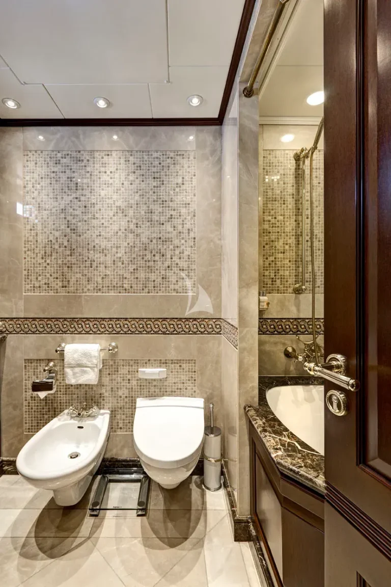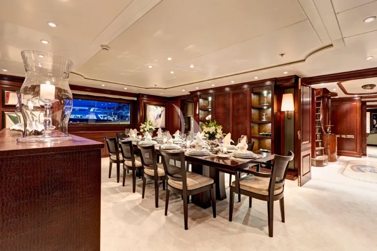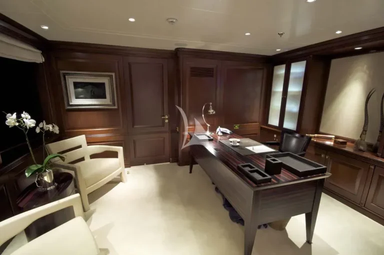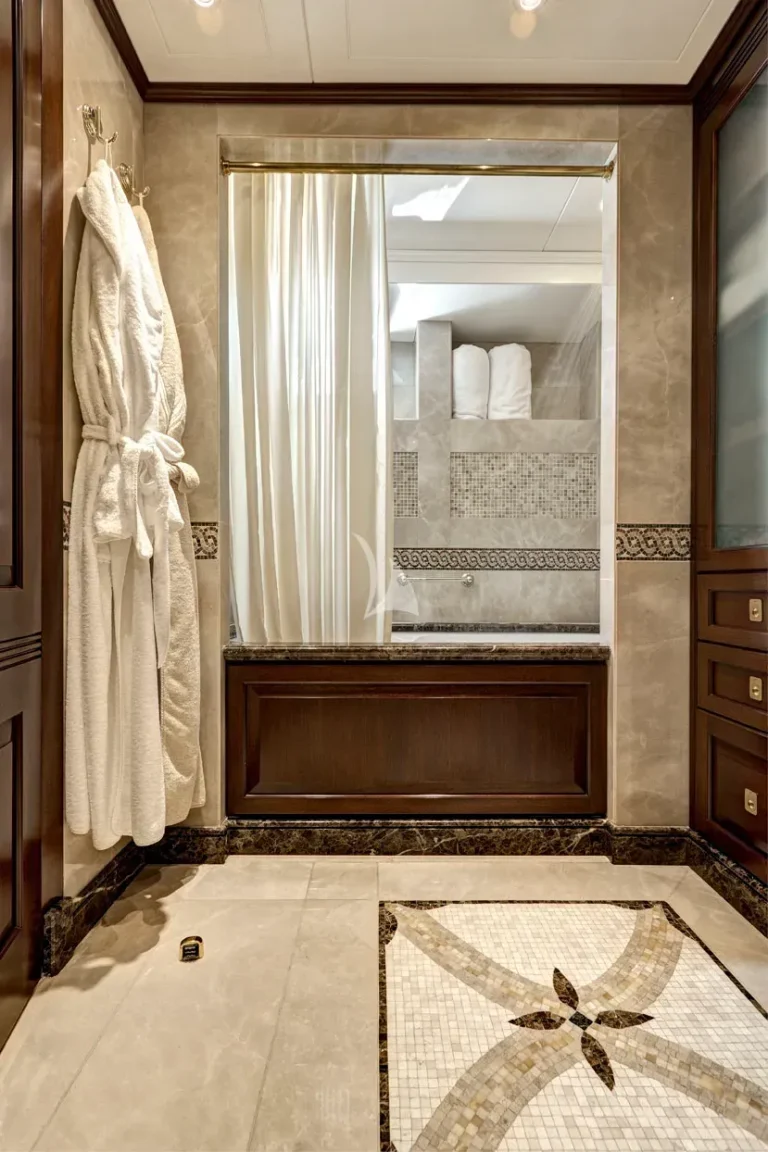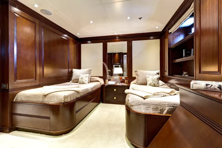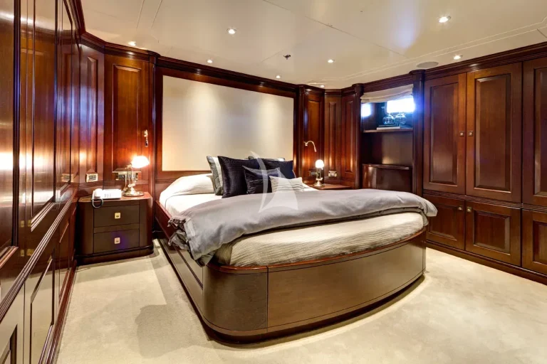 The full beam Owners suite is located on main deck, with the full beam VIP suite and four guest cabins located on lower deck.