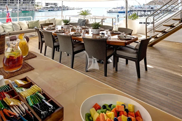 The spacious bridge deck features al fresco dining that is covered and a fix seating area aft.