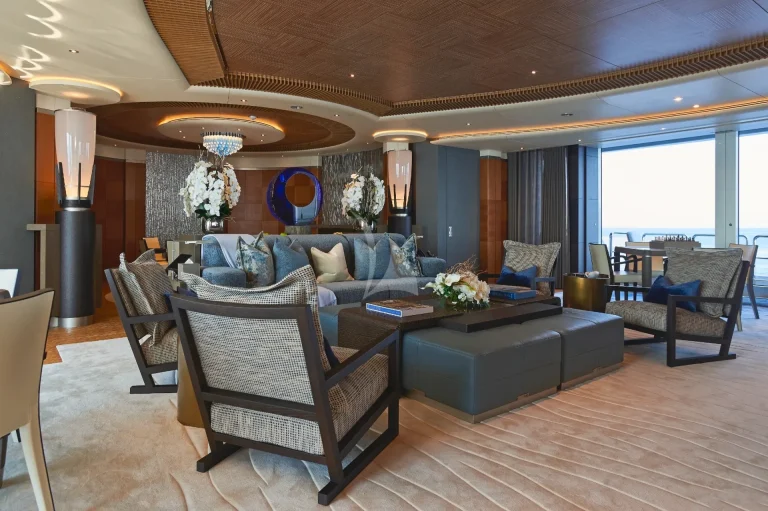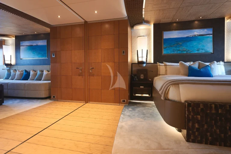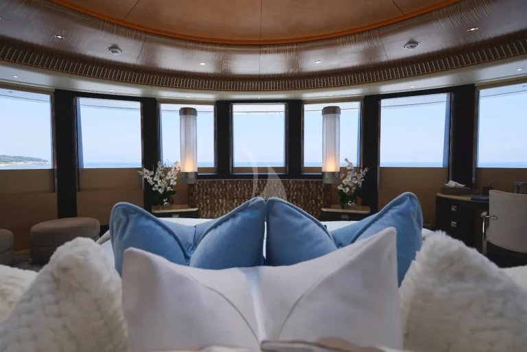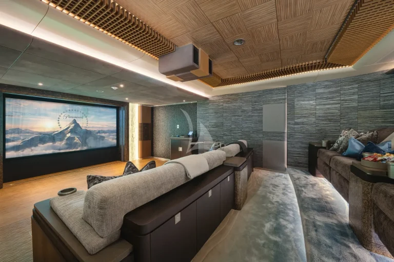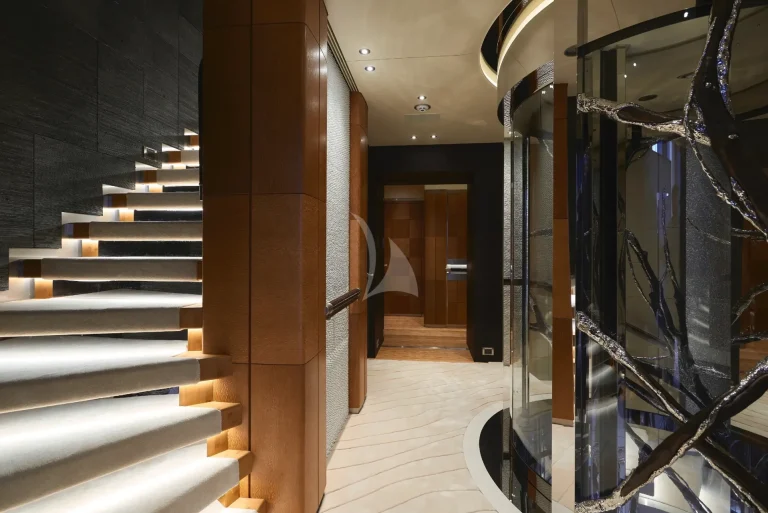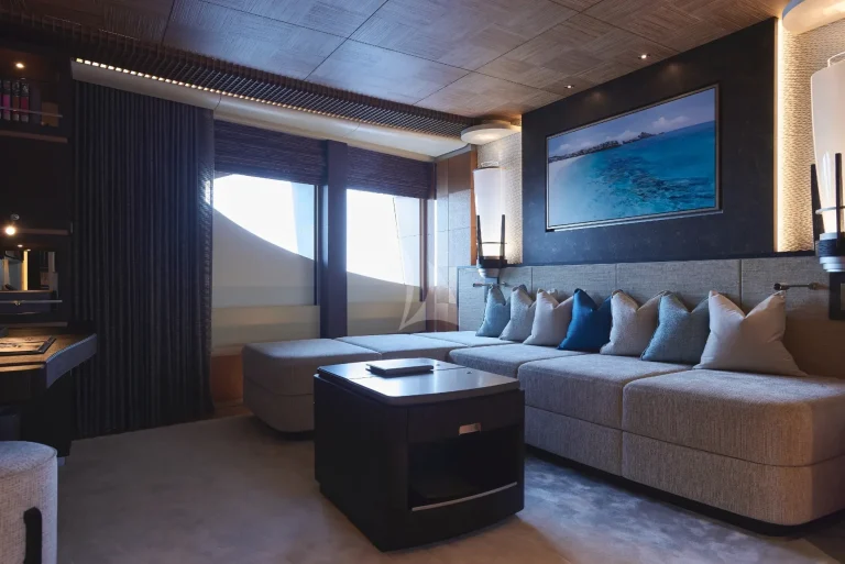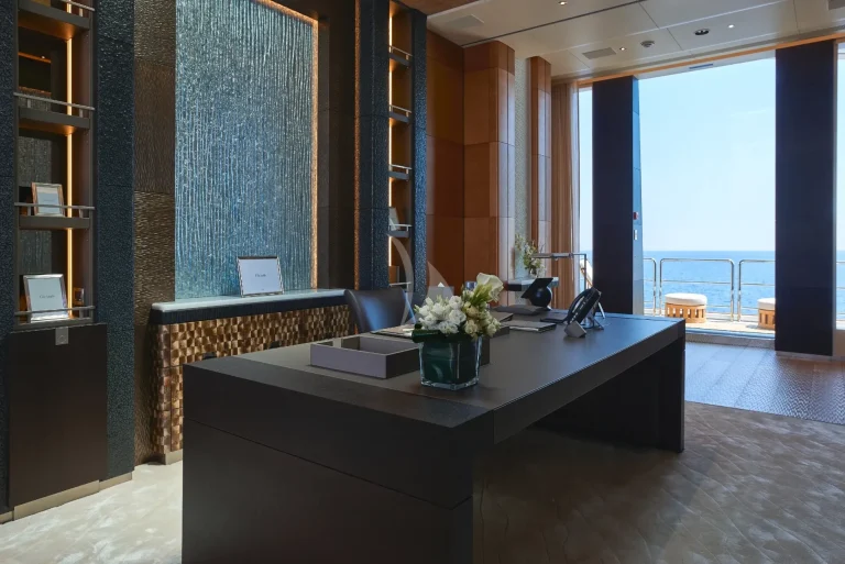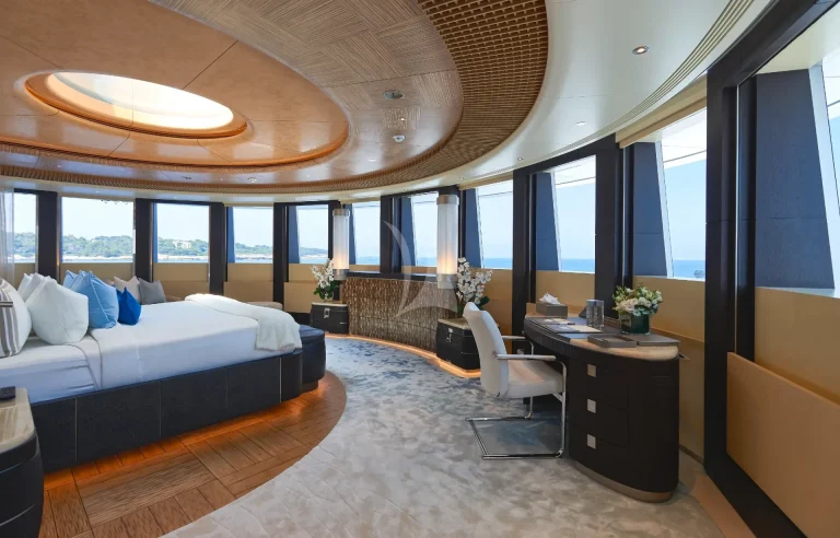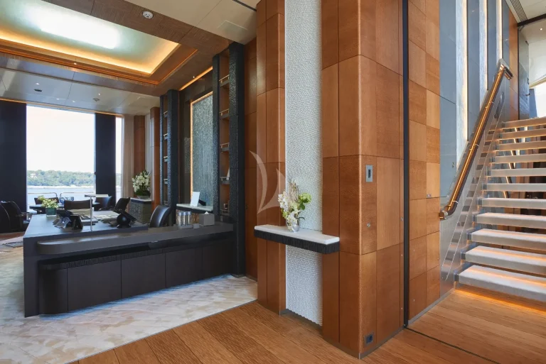 The extensive accommodation on board comprises a unique split owner’s suite with stunning ocean vistas and an impressive double height study complete with port and starboard folding balconies and double height glass sliding doors. There is a double guest cabin on the upper deck, four guest cabins and a convertible full beam VIP cabin located on the main deck. Other standout features include a remarkable teak and steel sculpture that envelops the large guest elevator, a spectacular aquarium made to mirror an aquatic reef, an outdoor cinema on the sun deck and a huge lazarette ideal for a watersports enthusiast.