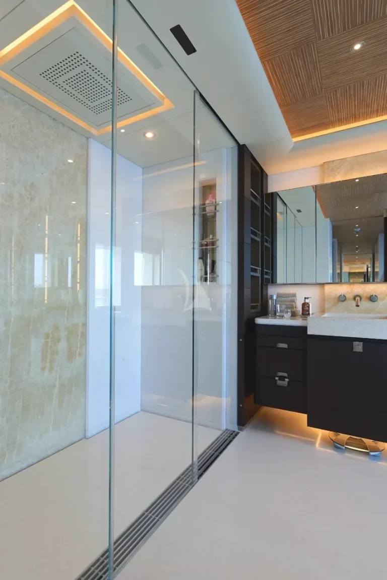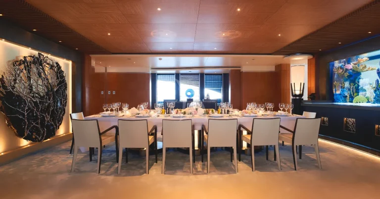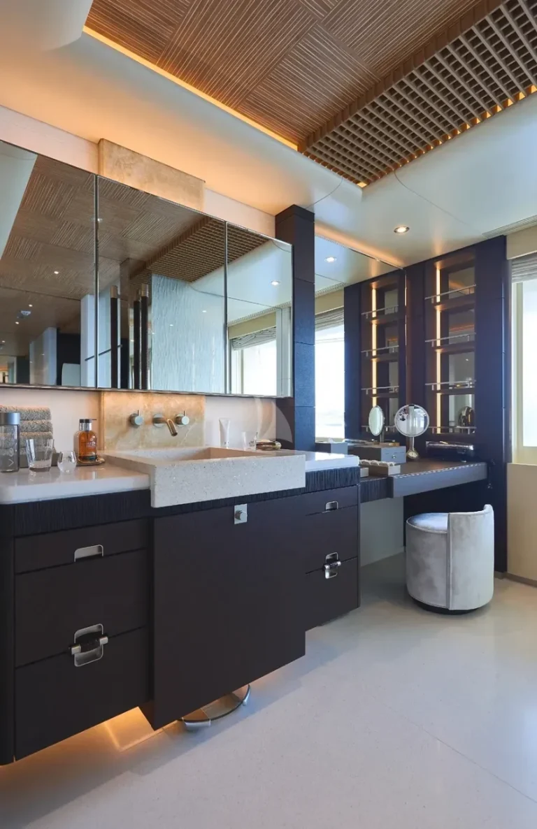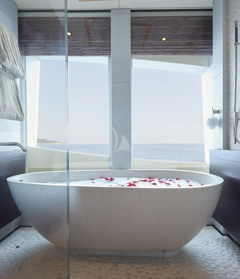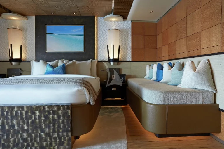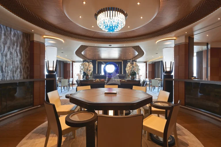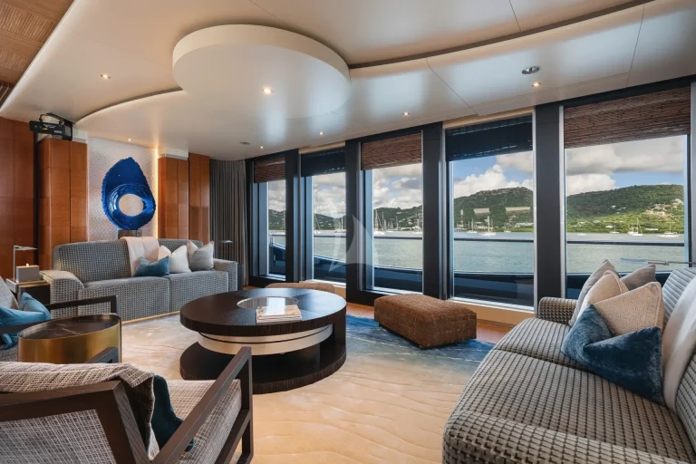 The extensive accommodation on board comprises a unique split owner’s suite with stunning ocean vistas and an impressive double height study complete with port and starboard folding balconies and double height glass sliding doors. There is a double guest cabin on the upper deck, four guest cabins and a convertible full beam VIP cabin located on the main deck. Other standout features include a remarkable teak and steel sculpture that envelops the large guest elevator, a spectacular aquarium made to mirror an aquatic reef, an outdoor cinema on the sun deck and a huge lazarette ideal for a watersports enthusiast.