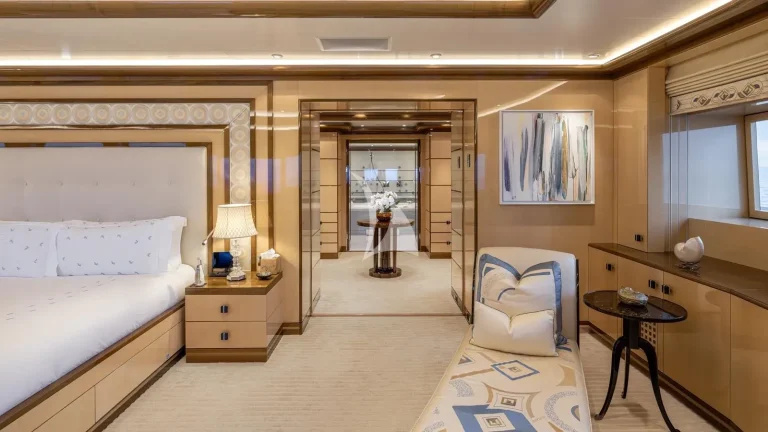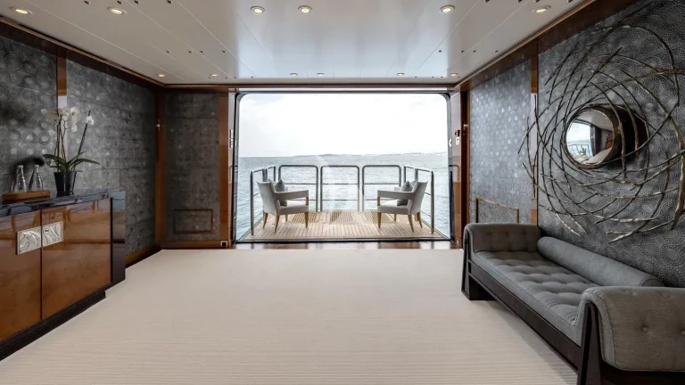 For those seeking adventure, BATELLO’s massive garage and extensive toy collection ensures endless entertainment on the water, featuring a chase boat for private excursions, a thrilling inflatable slide and a rock climbing wall for added excitement. Guests can also enjoy a game of basketball or pickleball on the versatile ball sports area on bridge deck aft, adding a competitive edge to their time on board. Built with a steel hull and equipped with Rolls-Royce zero-speed retractable stabilizers, she guarantees maximum comfort and stability at sea.