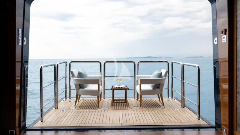 BATELLO’s onboard spaces are designed for both relaxation and entertainment. The main salon seamlessly transforms into a cinema room, complete with a dropdown projector for an immersive viewing experience. On the bridge deck, guests can enjoy a sun lounge with a chef station with BBQ and a sit-up bar, perfect for socializing over cocktails. Open-air dining, shaded by the deck overhang, offers a stunning setting for alfresco meals, enhancing the yacht’s exceptional experience.