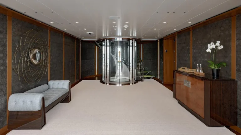 Her striking volumes house state-of-the-art amenities to elevate the onboard experience, blending luxury with wellness and accessibility. The sundeck’s heated swimming pool, equipped with an exercise jet pump, offers a perfect balance of relaxation and fitness with breathtaking ocean views. A dedicated wellness area features a fully equipped gym, beauty salon, and massage room, providing an oasis for rejuvenation at sea. Ensuring seamless movement throughout, a spacious, wheelchair-accessible elevator connects all interior decks, enhancing convenience for every guest.