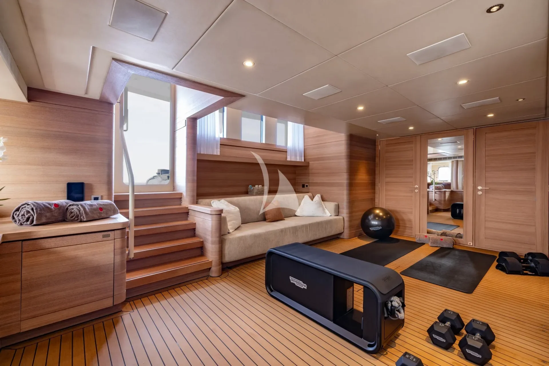 Equally impressive are BIJIN’s expansive outdoor spaces, spanning over 237sqm. The foredeck transforms into a vibrant entertainment area once the rescue tenders are deployed, perfect for hosting celebrations. The aft lower deck boasts a 21.5sqm beach club and wellness area complete with a newly equipped gym with a Technologym treadmill, spinning bike and training tools, as well as a sauna, all accessible from the main lounge via a spiral staircase.