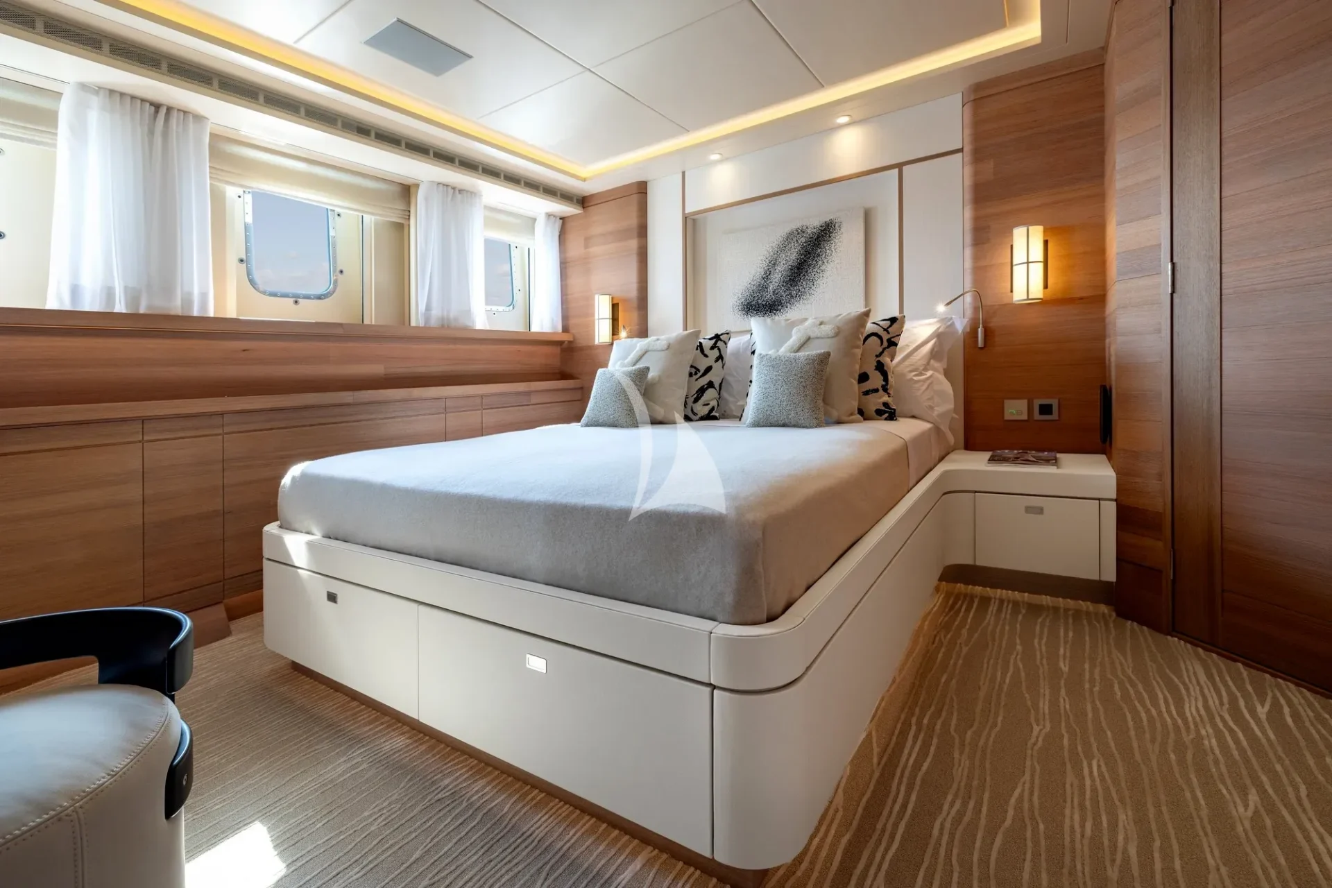 Welcoming 10 guests in five cabins, including an exceptional 61sqm master suite located on the main deck forward with his-and-hers dressing rooms and dual en suite bathrooms for unparalleled privacy and comfort. The lower deck features two VIP suites, one twin cabin, and one double, all with en suite facilities.