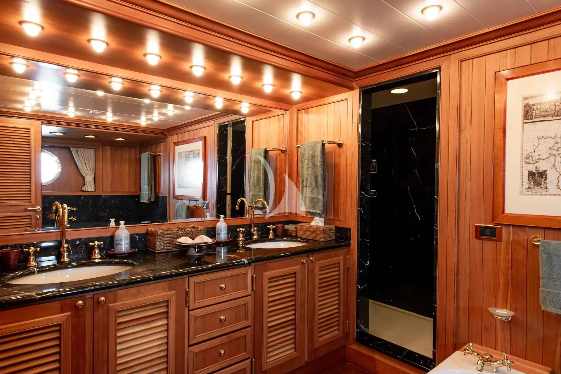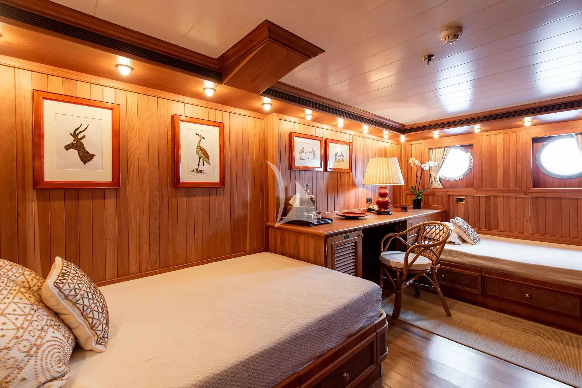 Carried out in Turkey and overseen by her experienced Owner, this first rebuild was classified as a new construction by Lloyds and saw the creation of a brand new superstructure for BLEU DE NÎMES with yacht designer Peter Birkett keeping only the steel hull from the original vessel. BLEU DE NÎMES’ initial conversion was then followed by a second rebuild carried out in Italy from 2016 to 2020. Overseen by Studio Nattero, during her second rebuild BLEU DE NÎMES was extended by 16 metres with the addition of four new guest cabins, two tender garages, a central stairway and a super yacht lift. This second conversion took BLEU DE NÎMES from a family yacht to an ultra-luxurious explorer yacht with a stylish Pier Vittorio Cerruti interior and accommodation for up to 28 guests across her 13 staterooms. Guest accommodation onboard includes a stunning full-beam Owner’s suite with a private study plus his & hers dressing rooms and ensuite bathrooms, two VIP cabins, six double cabins, two triple cabins and two twin cabins each with an additional Pullman berth. BLEU DE NÎMES also has two staff cabins plus accommodation for her 23-person crew on the lower decks.