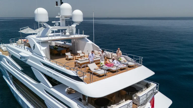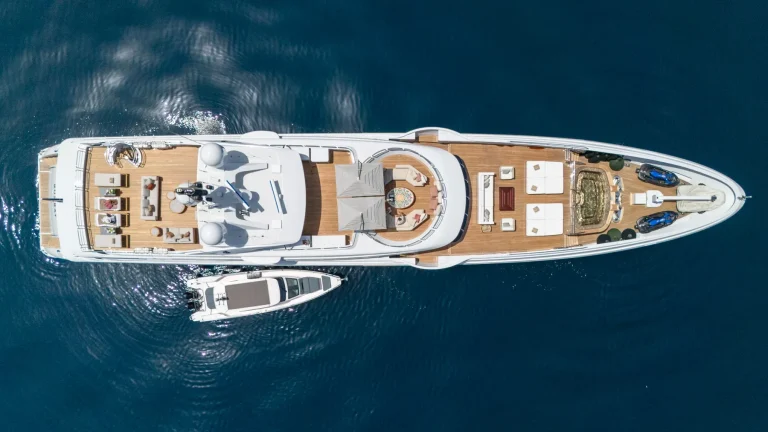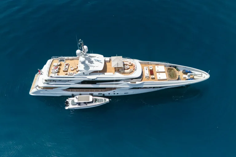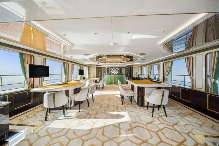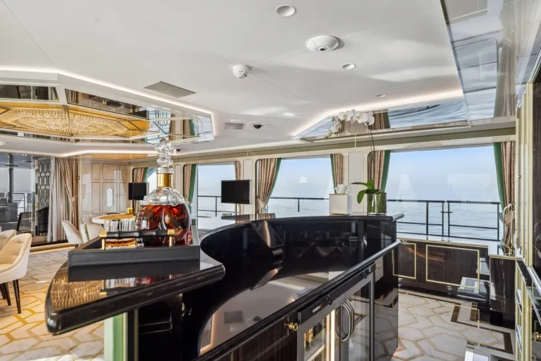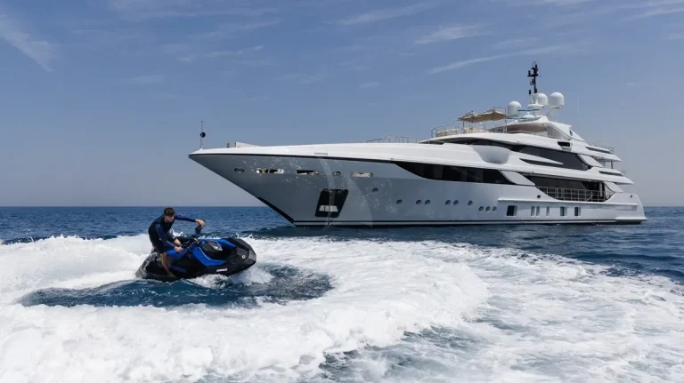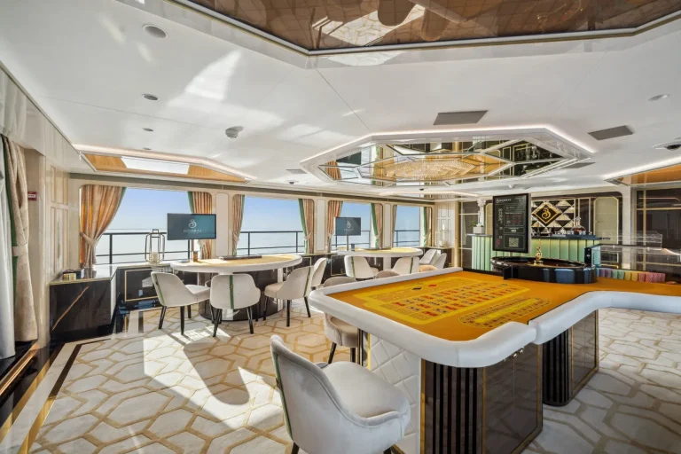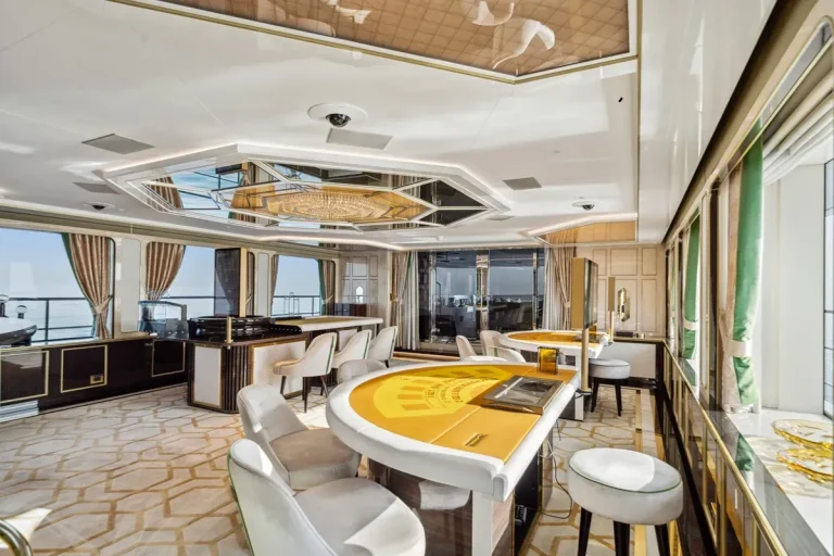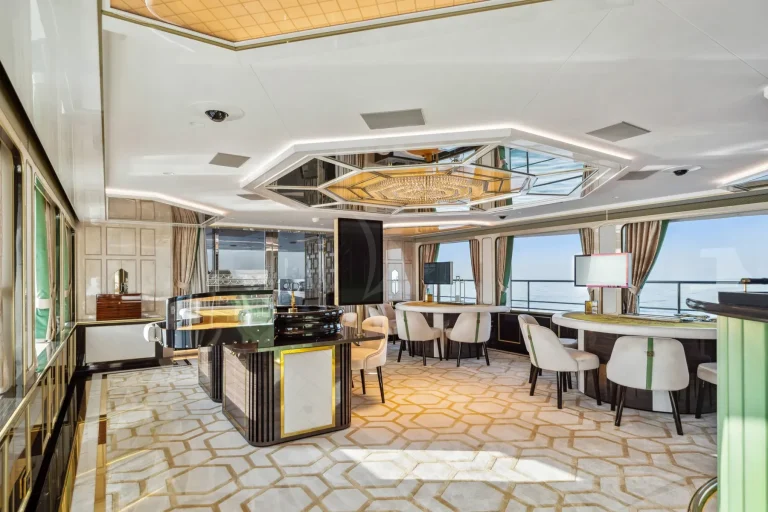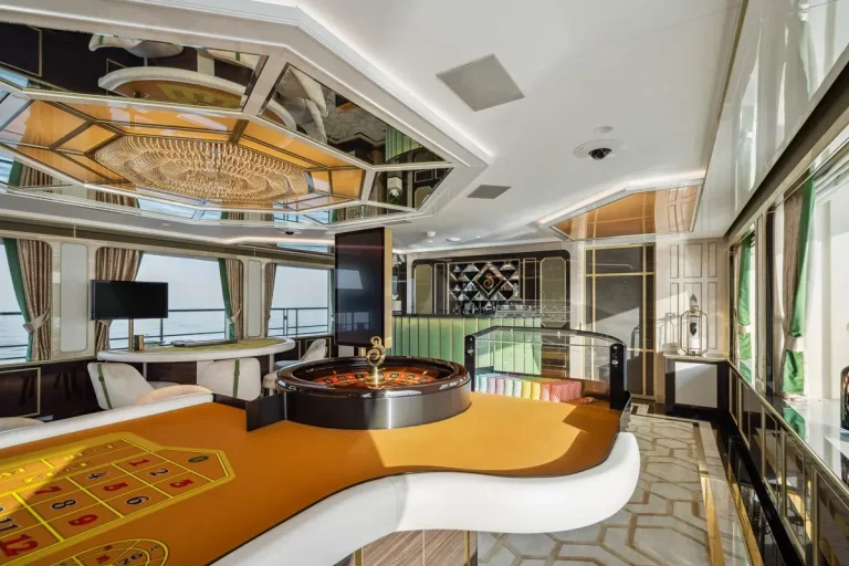 The yacht offers a wealth of luxurious amenities and an impressive array of entertainment options, including a Jacuzzi on the sun deck, a beach club with dayheads, a dedicated watersports centre, underwater lights, air conditioning throughout, and a dedicated casino onboard.