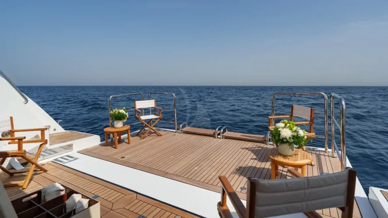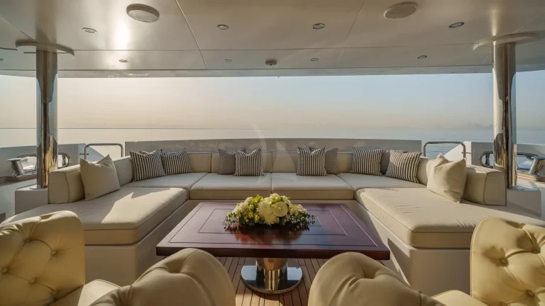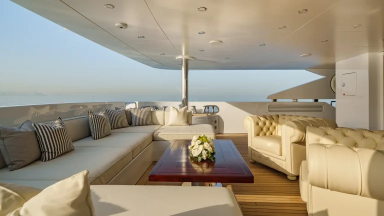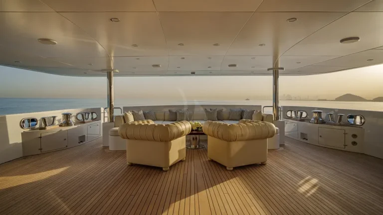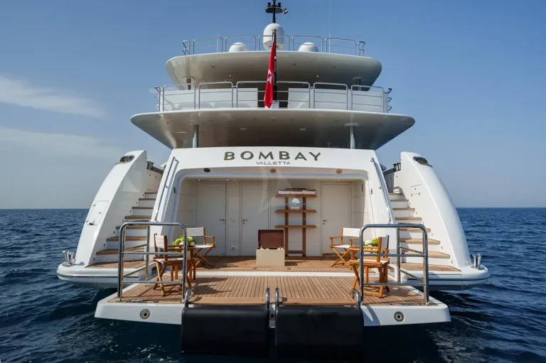 She features a full-displacement GRP hull and an aluminium superstructure, complemented by elegant teak decks. With a beam of 9.20 metres and a draft of 2.70 metres, BOMBAY boasts a generous interior volume of 487 GT.