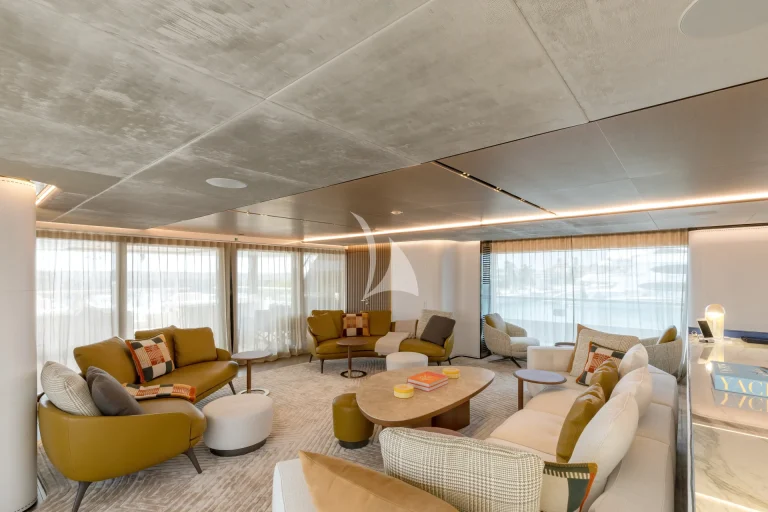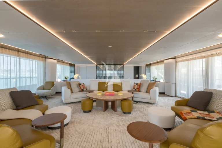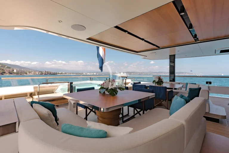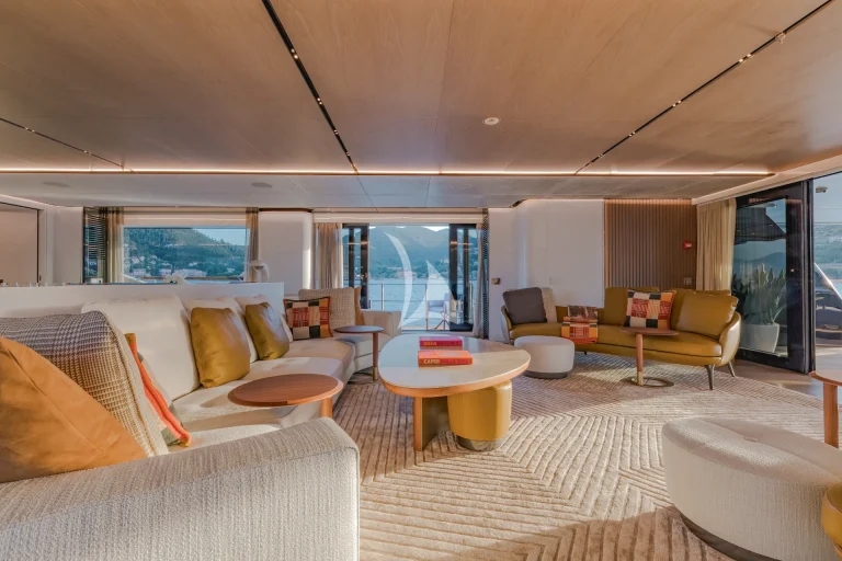 The main salon is carefully designed to accommodate modern family life and features floor-to-ceiling windows and retracting glass doors that reveal a balcony to one side. The sophisticated lounge is adorned with bespoke furniture by Italian designers Belvedere, alongside customised Minotti pieces. Every detail has been meticulously curated, from the plush new soft furnishings to the custom-designed carpets. The beautifully crafted dining table offers a luxurious dining setting with seating for 12. On the upper deck, guests will find another glamorous lounge space with a projector for movie nights.