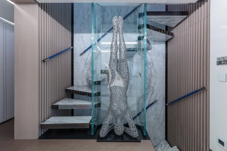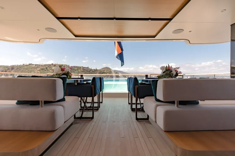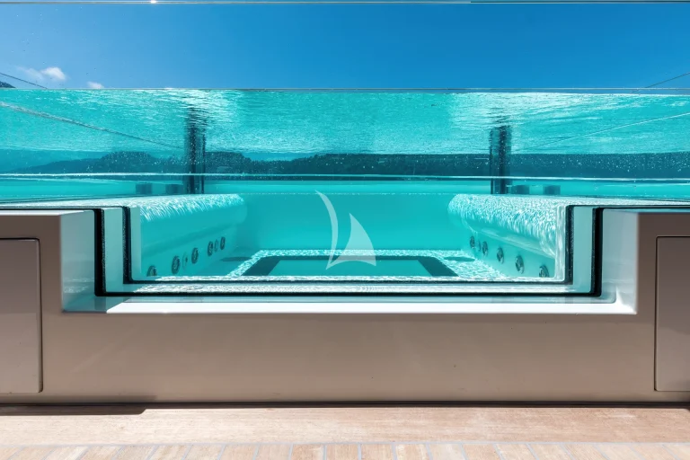 When it comes to exterior spaces, C has an amazing glass jacuzzi pool on the main deck, two extendable dining tables on the upper deck, as well as a circular seating area and second jacuzzi pool on the sundeck.