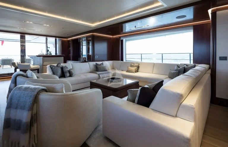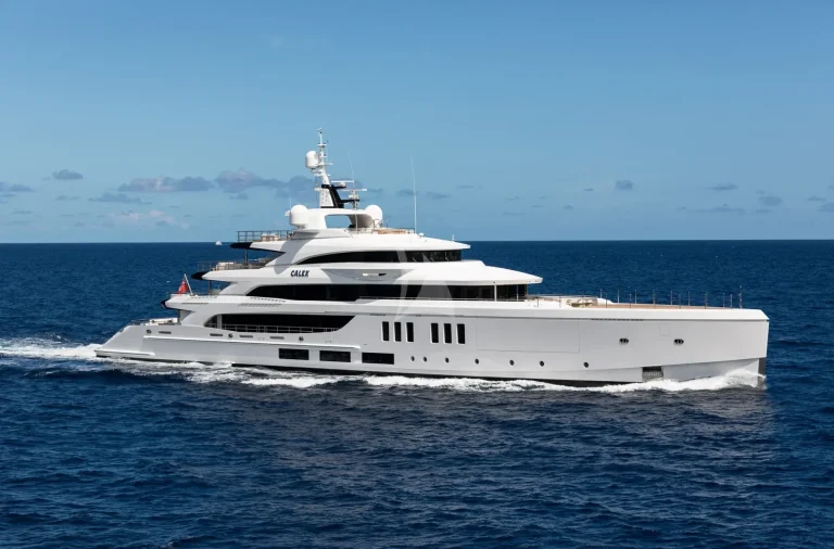 CALEX’s interior is adorned with a beautiful mix of light and dark shades, white statuary, gleaming marble and stunning ivory-colored furnishings giving an overall feeling of serenity. Guests can admire the rare sculptures and treasures picked up along the yacht’s travels. The main salon is a very sociable area with a huge U-shaped sofa, armchairs, a full bar, pop-up TV and a dedicated dining table. Accessibility has been carefully considered. Guests can travel between the many interior decks effortlessly in the stunning glass elevator. The deck furniture can also be configured depending on requirements. CALEX’s exceptional Benetti craftsmanship and clever use of space are demonstrated across the entire yacht, enveloping guests in luxury from deck to deck.