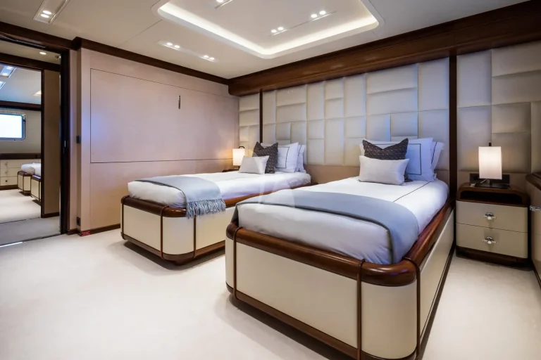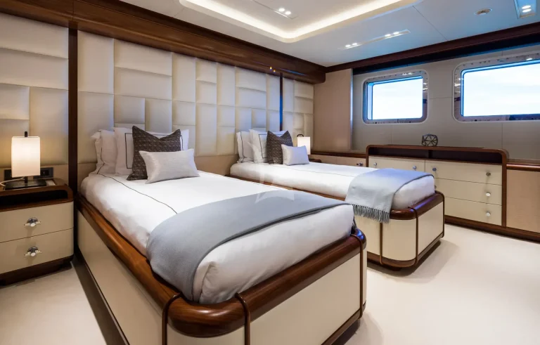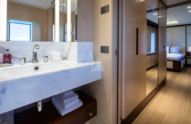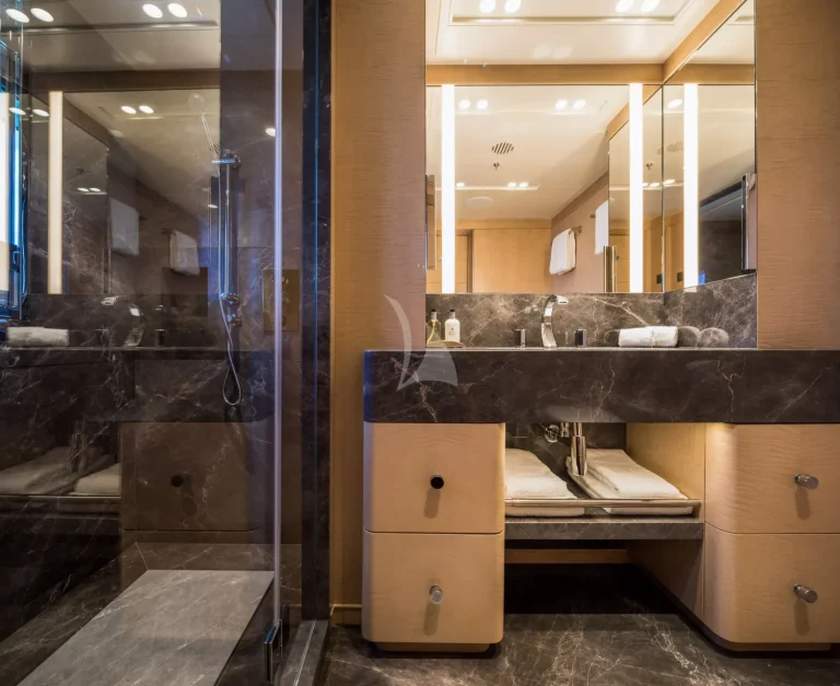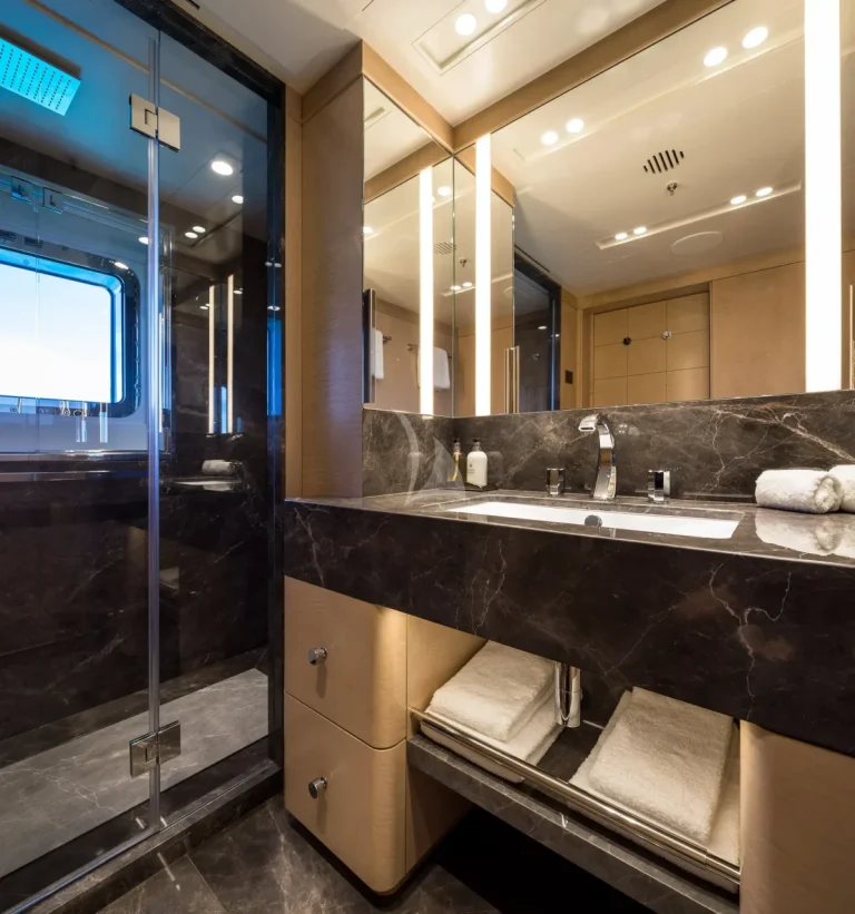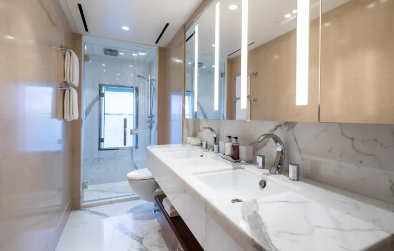 Her six guest cabins, two VIPs on the main deck, two kings and two convertible twins with Pullmans on the lower deck, all offer the same chic marble ensuite bathrooms. CALEX’s clever layout is extremely charter-friendly with versatile guest accommodation and a multitude of different zones on board for guests to enjoy depending on their mood.