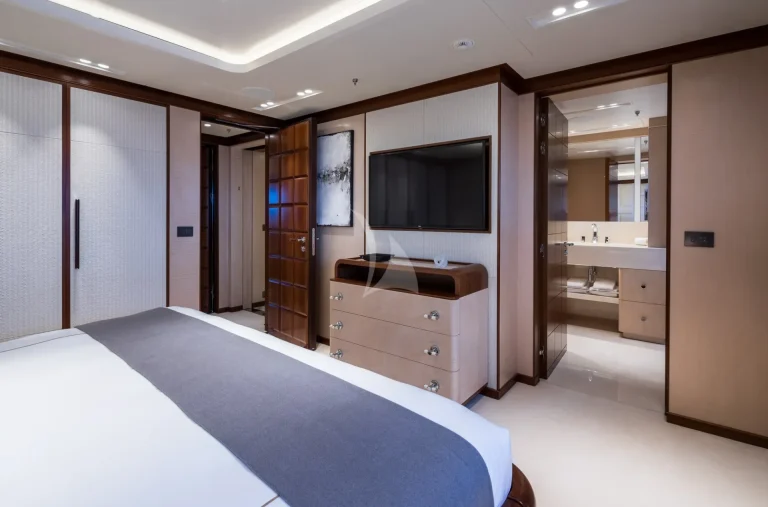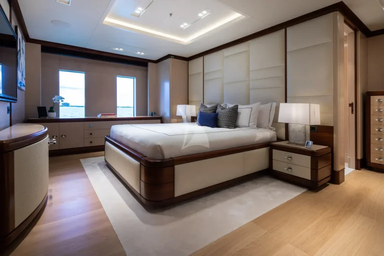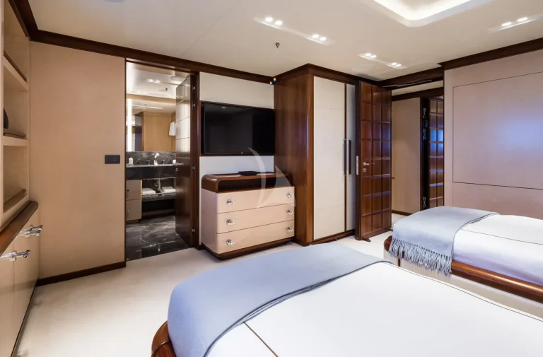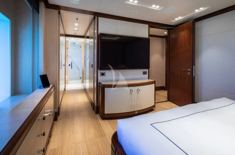 This charter yacht is a dream for those seeking to take advantage of all things alfresco. From the main deck aft and upper deck aft, guests can enjoy meals and entertainment surrounded by unbeatable views. CALEX’s sundeck is second to none with a dedicated workout and yoga space, a Jacuzzi and plenty of space to recline. Her bridge deck has an outdoor space with a lounge area and a bar. Her best feature in our opinion, has to be the five-star beach club. For those interested in hanging out waterside in style, this prime real estate invites guests to rejuvenate in the hammam, rehydrate at the bar, watch the game on TV or simply enjoy the vast array of watersports on offer.