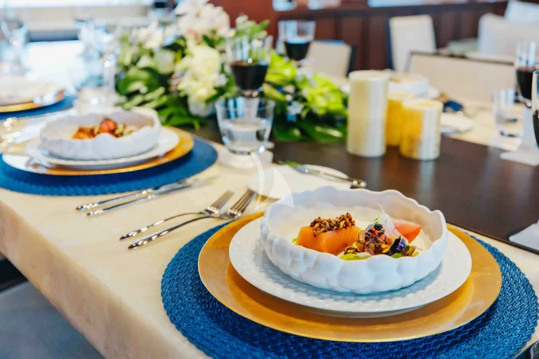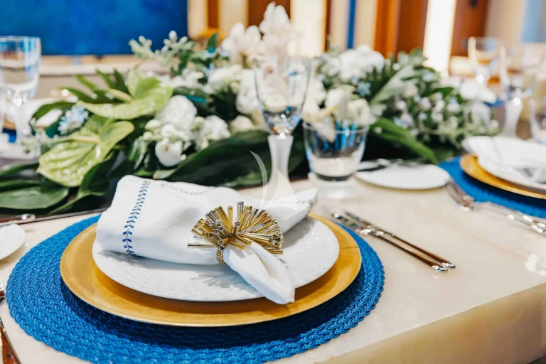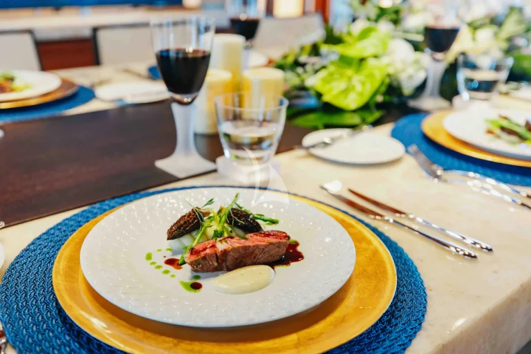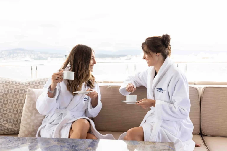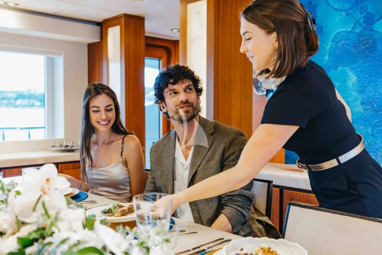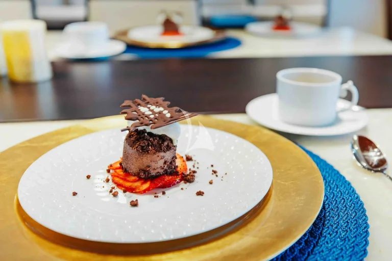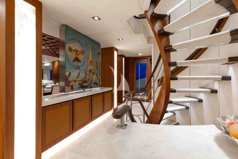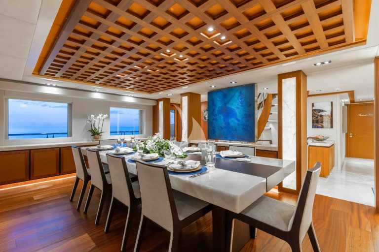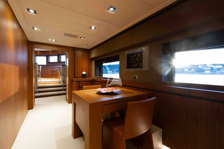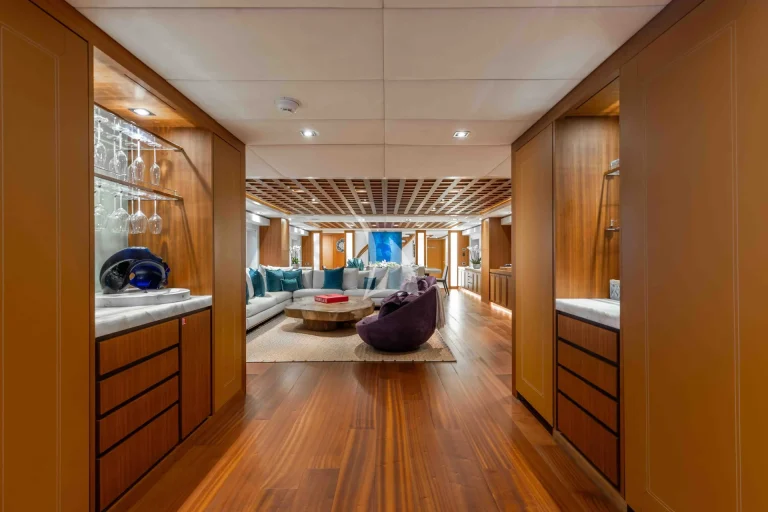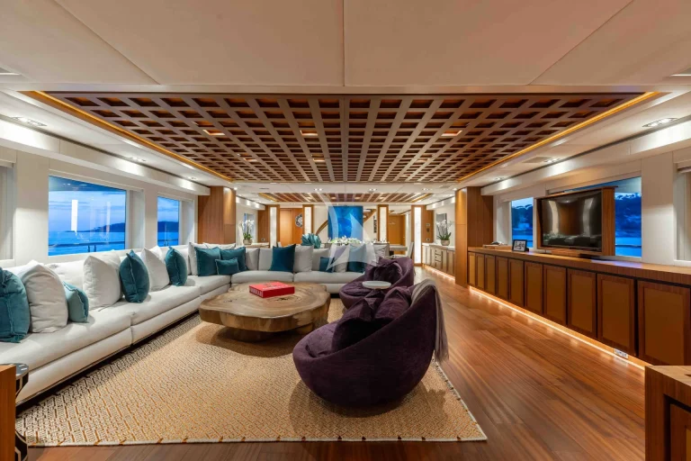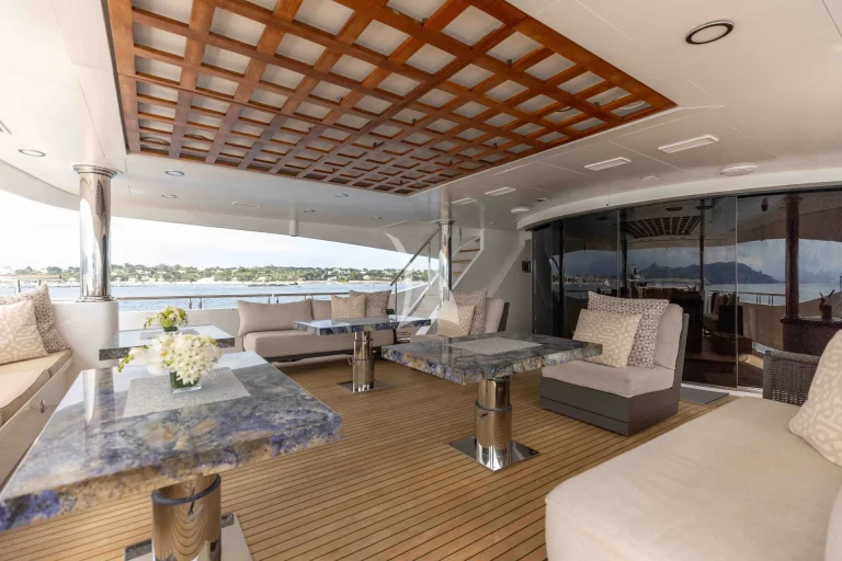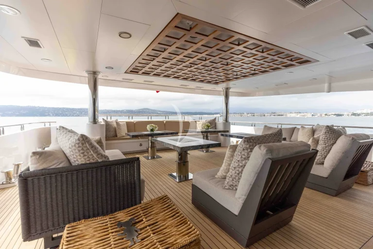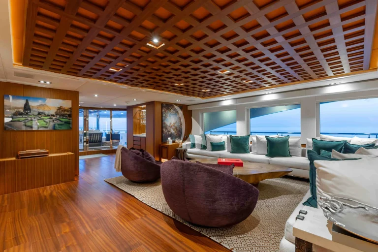 CHAMPAGNE SEAS’s interior spaces are light and airy, characterized by a soothing color palette and high-quality materials that create a warm, inviting atmosphere. Guests can gather in the main salon and sky lounge, both designed with ample seating, panoramic windows, and a relaxed yet refined ambience. Outside, the expansive sun deck is a focal point for entertaining and leisure, with a Jacuzzi, sun pads, and a bar area—ideal for taking in the surrounding views.