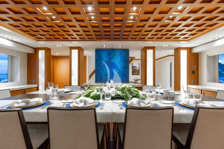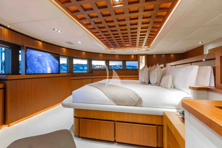 On board, CHAMPAGNE SEAS welcomes up to 12 guests in six beautifully appointed staterooms, each featuring modern décor and tasteful finishes. The full-beam master suite—situated on the main deck—provides exquisite privacy with a spacious layout and sophisticated styling. Four additional guest staterooms are located on the lower deck, and one is located on the upper deck, ensuring every guest enjoys world-class comfort and amenities.