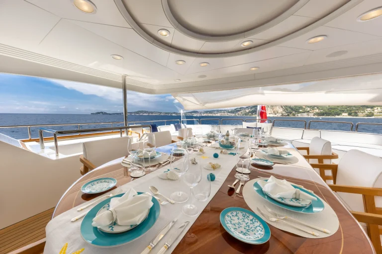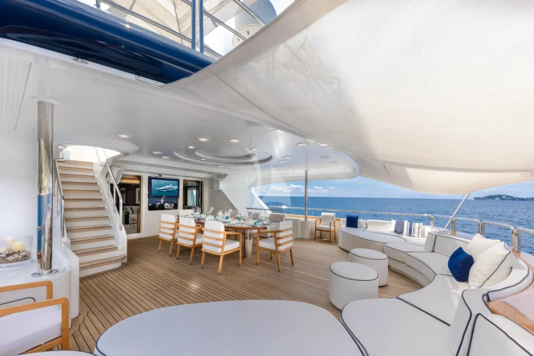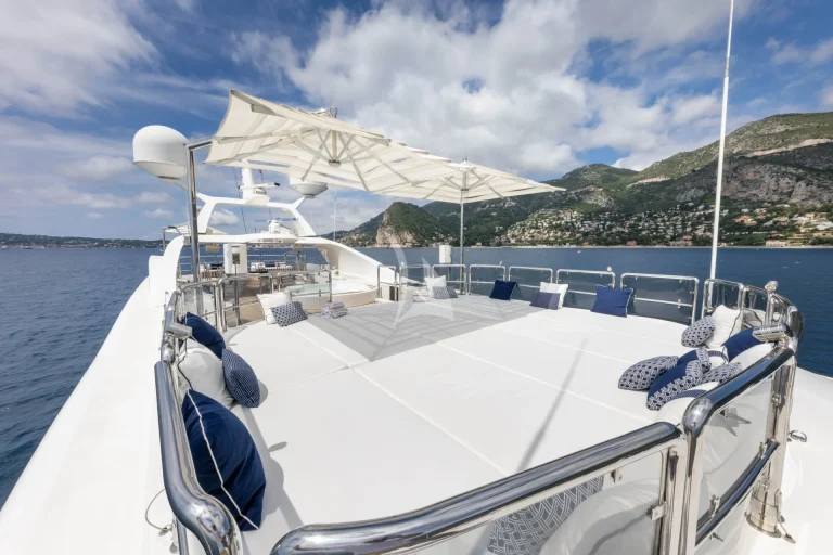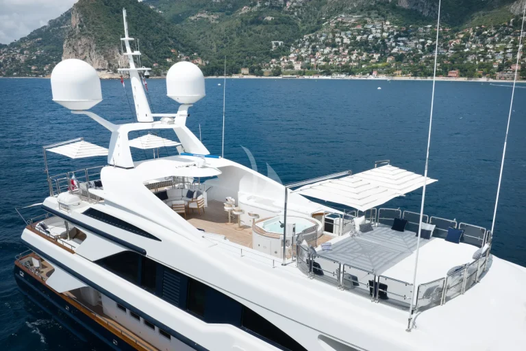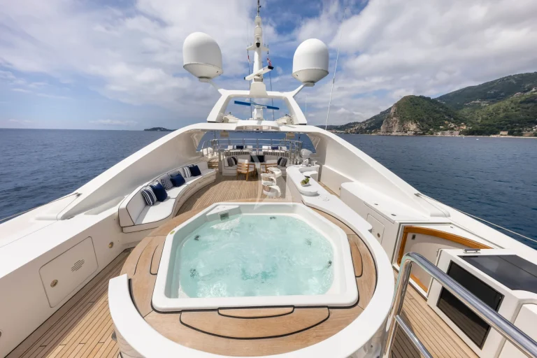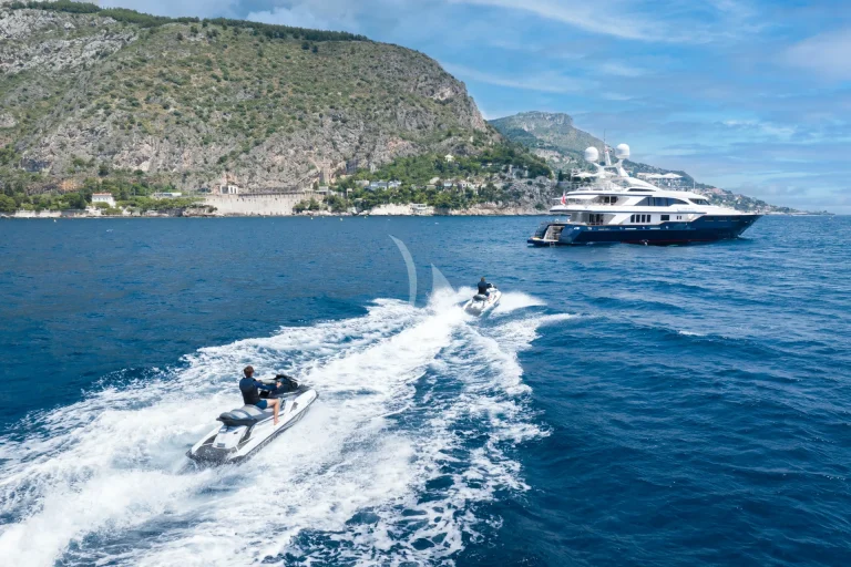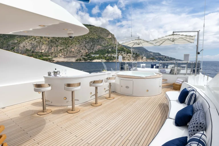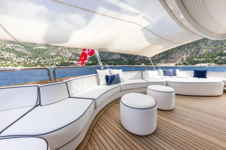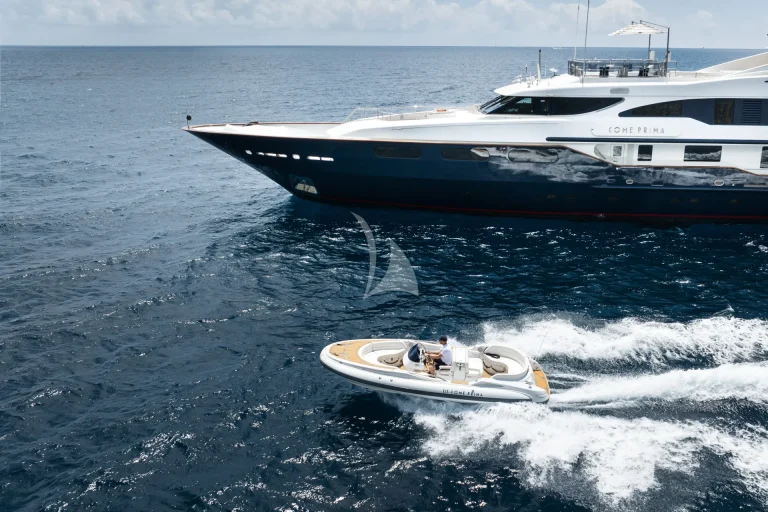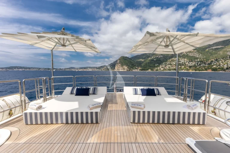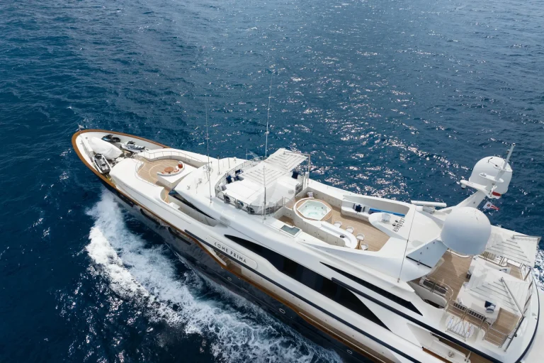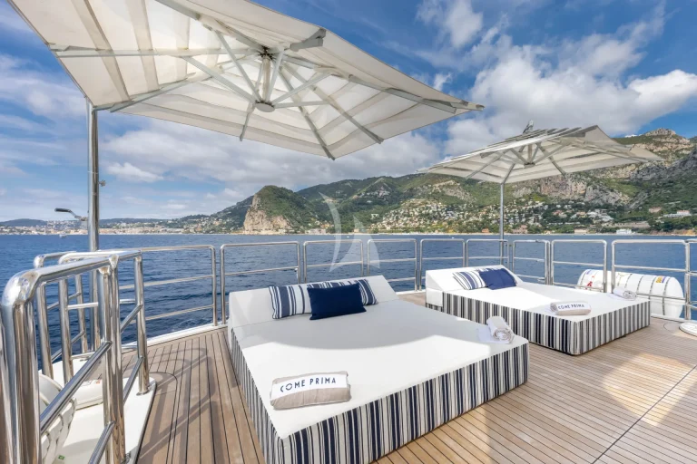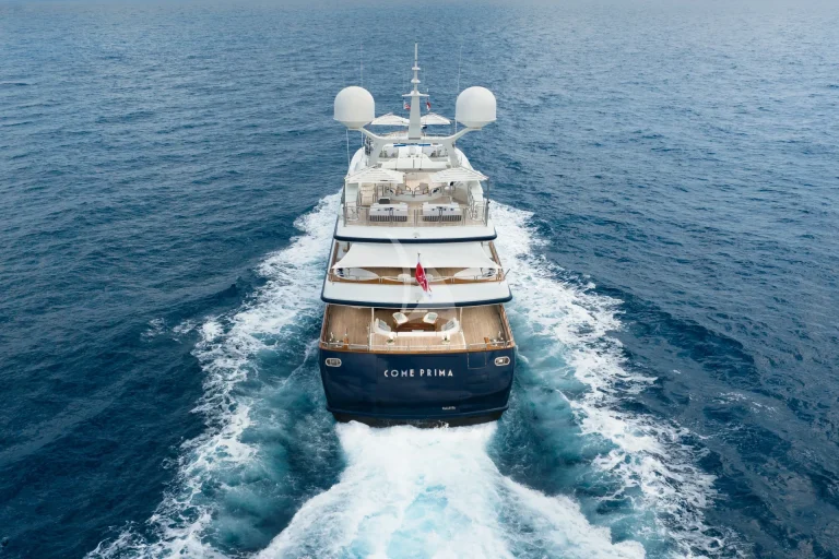 At 50m (164’ 1”) long, this tri-deck motor yacht offers a charming space from which to relax and unwind. Packed with amenities, COME PRIMA accommodates up to 12 guests in her 6 staterooms. Located on the sun deck is a large shaded sunbathing platform, Jacuzzi, bar and lounge area. Her main deck includes a second sunbathing platform and dining area. A water sports centre and gym area complete her exterior. The interior includes a full beam master stateroom on the main deck, a VIP cabin on the upper deck that converts into a twin cabin, 2 double cabins and 2 twin cabins located on the lower deck. A main salon and dining area offer sumptuous relaxation, and a second lounge and bar area provide a superb space for entertaining. Entertainment onboard includes a home theatre television and media centre, wifi throughout and an exceptional range of water toys.