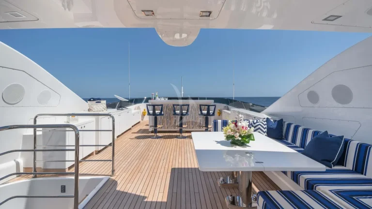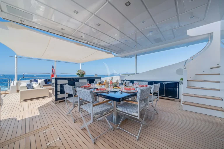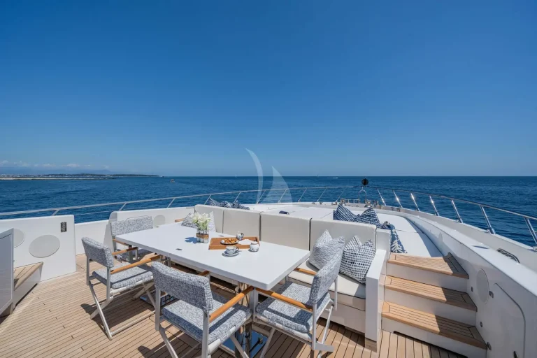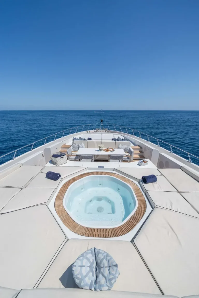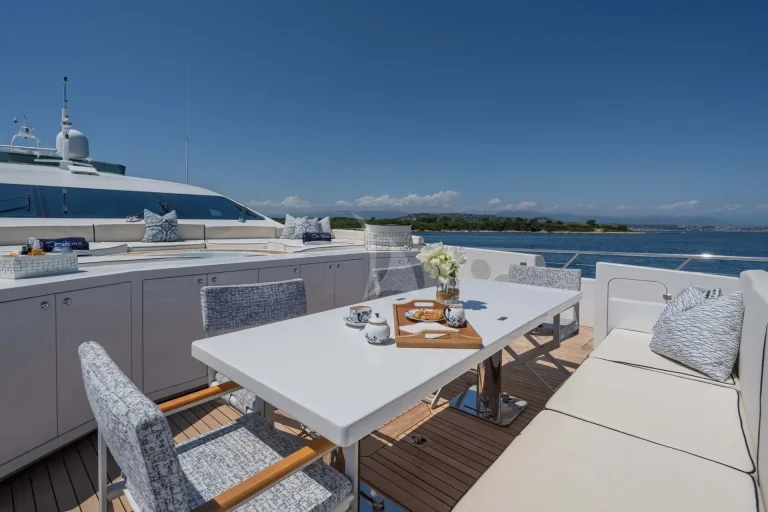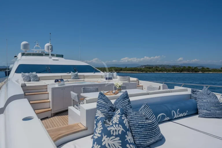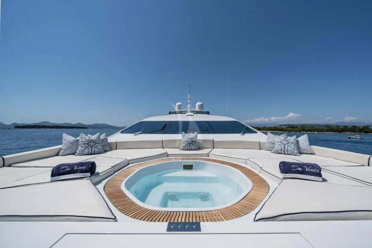 Her top performance does not outweigh the stunning style of this yacht. DA VINCI features blonde teak plank flooring and exceptionally wide side decks with impressive sightlines past the shapely superstructure. Her on-deck layout is extremely spacious. Another remarkable space is the spa pool and her bathing platform, which beckons guests to soak up the sun.