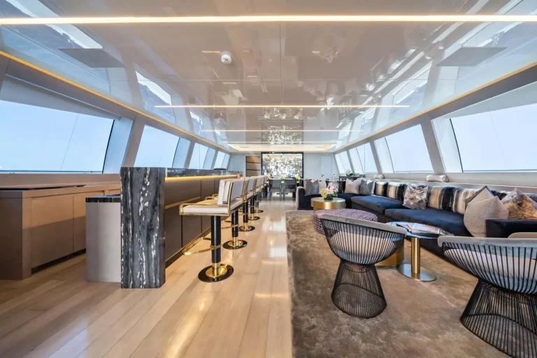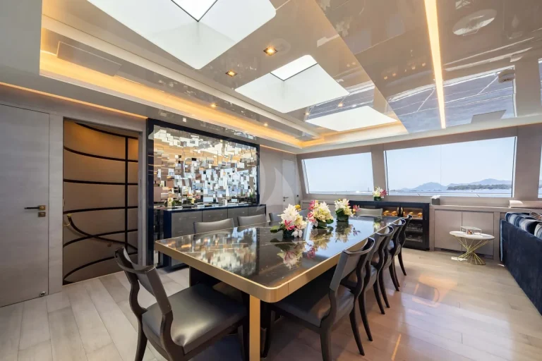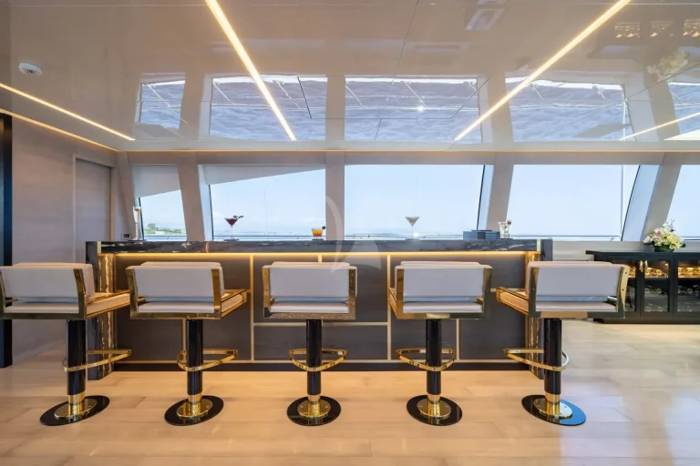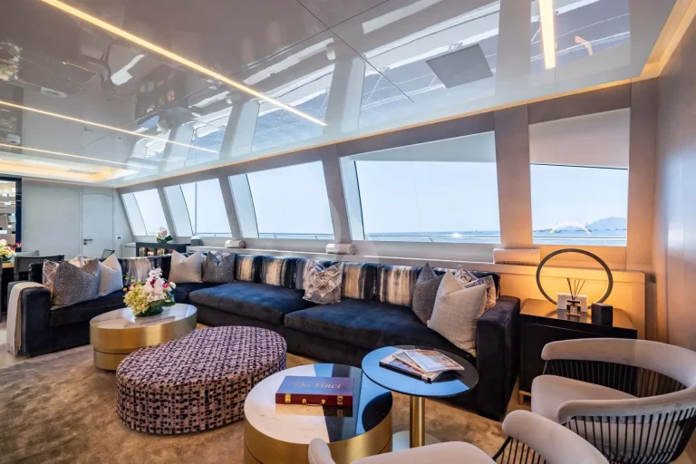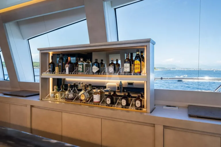 Indoors on DA VINCI, the main deck entertainment area is equally as spacious, with ample headroom. This space is further enhanced by natural light from large windows. The beautifully customized space has bleached oak flooring, a marble bar and a large sofa, which is as comfortable as it is elegant.