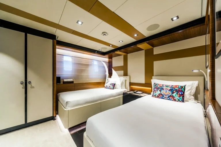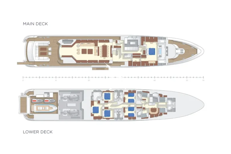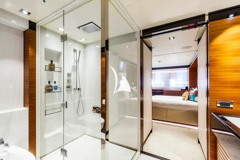 Retreat to the full-beam owner’s suite on the main deck, or relax in one of the five additional well-appointed cabins on the lower deck, including a VIP suite, two double cabins, and two twin cabins.