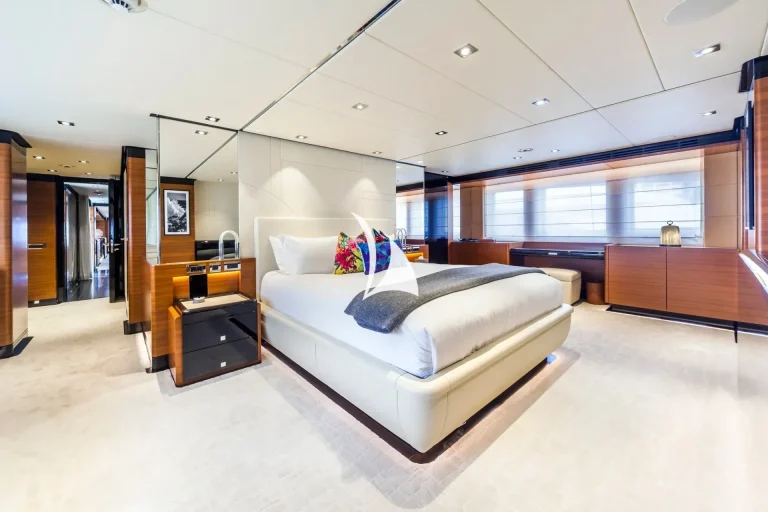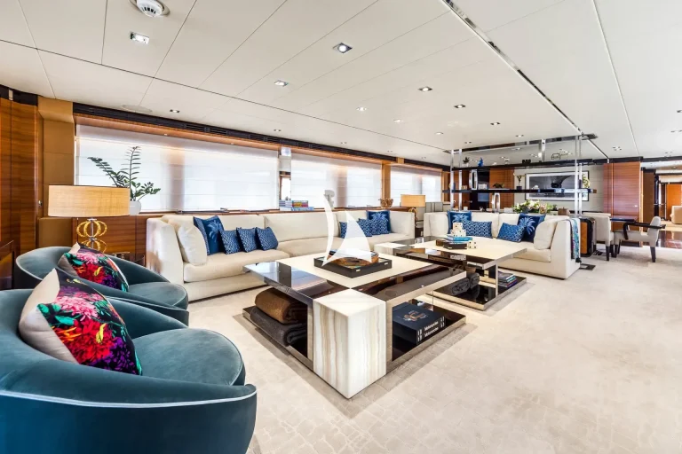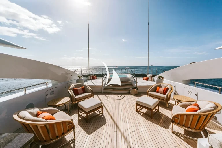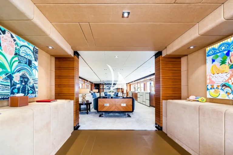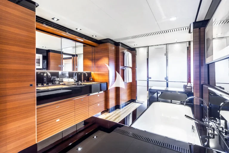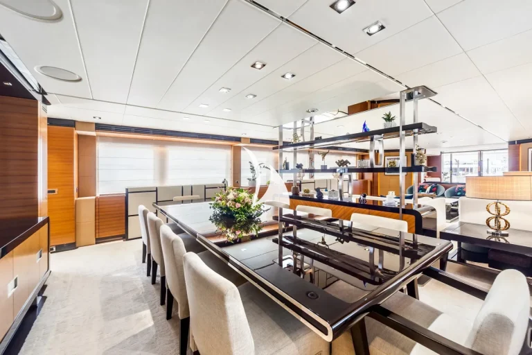 The main deck is the heart of sophistication, offering an ideal blend of indoor and outdoor living. The spacious living area is designed for comfort, while the dining room offers an elegant setting for formal meals. Step outside to the aft deck, where shaded coffee tables and sofas are the perfect place to enjoy afternoon tea or cocktails from.