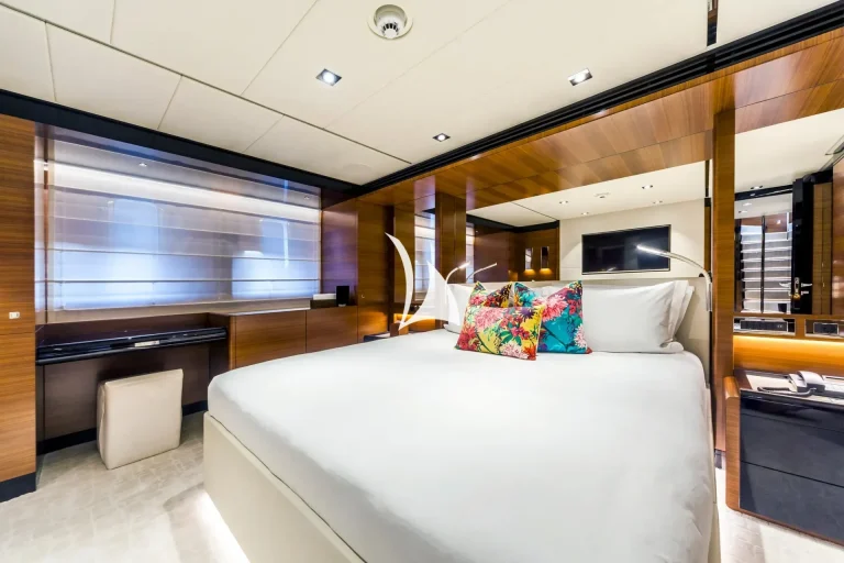 The bridge deck offers an inviting space for both entertainment and relaxation. The stylish circular saloon inside is ideal for socialising or taking in the panoramic views, while the large circular dining table on the aft deck is perfect for sunset dinners. Forward on the bridge deck, guests can enjoy the spacious sun pads, an ideal spot for lounging or enjoying a peaceful moment at sea.