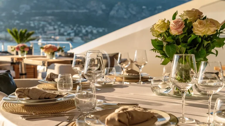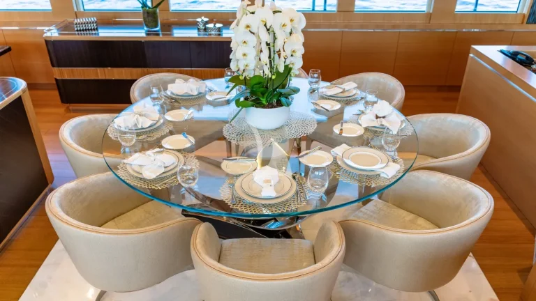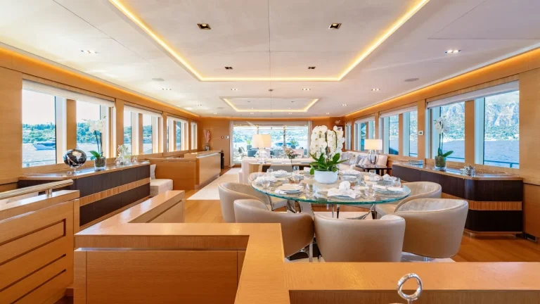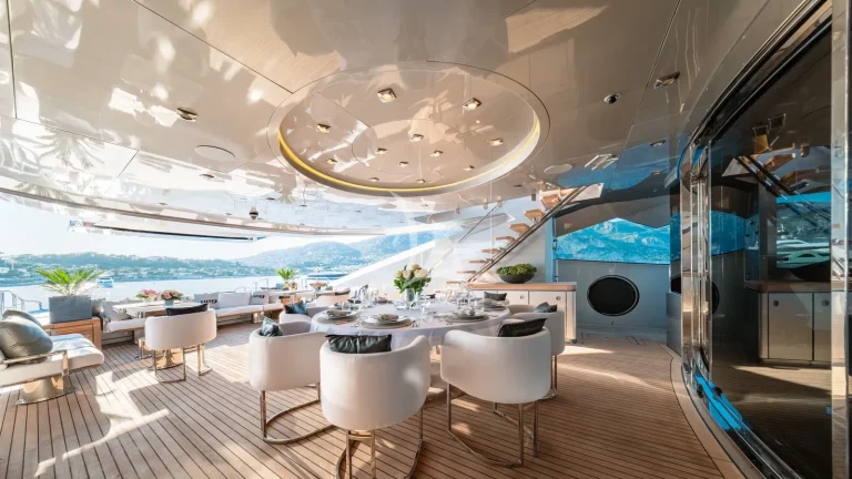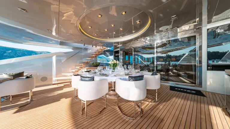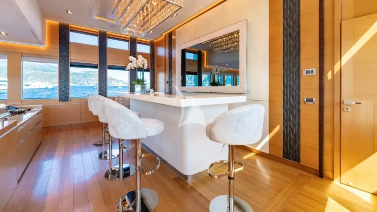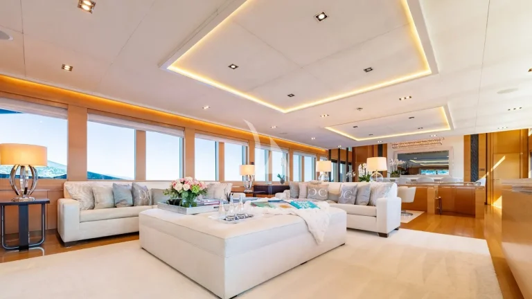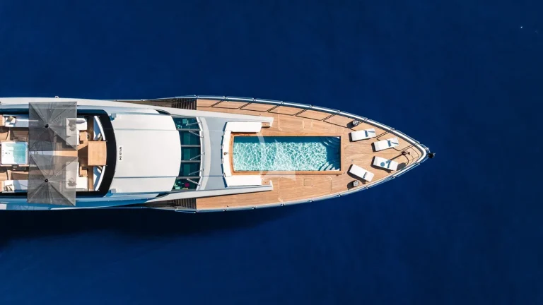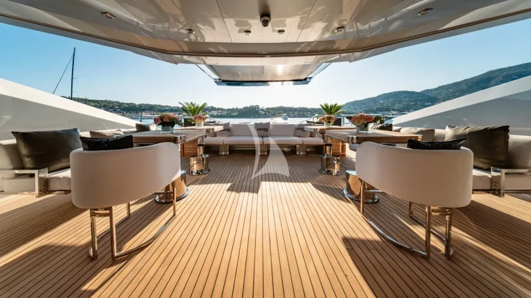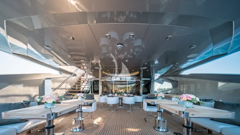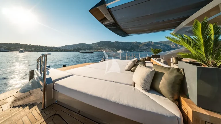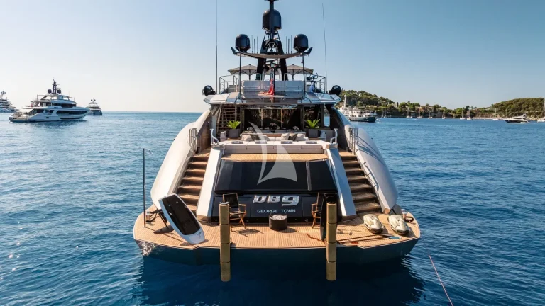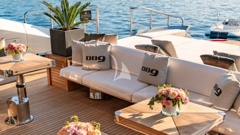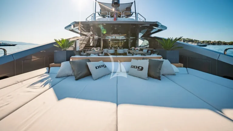 Accommodations include a generous full-beam owner’s stateroom, 2 Queen VIP staterooms, and 2 Twin staterooms. Every stateroom comes with an en-suite bathroom. Moving up to the sundeck, you will be greeted with stylish black lounge furniture and oversized parasols, as the vast sundeck is the ideal space to unwind. Take a dip in the on-deck jacuzzi, enjoy a leisurely lunch overlooking the Mediterranean or sit back and watch a movie screened on DB9’s open-air cinema. The options are endless aboard luxury yacht DB9!
