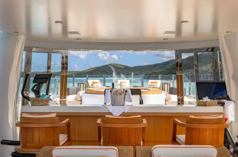 DEEP BLUE exterior spaces are highly adaptable, offering numerous open-air lounging and dining options. The Upper Deck features a generous dining table perfect for casual meals, and the Sun Deck includes a central wet bar, a large jacuzzi, and expansive sunbathing areas both aft and forward, ideal for enjoying the sun all day. This area can also transform into a fully equipped open-air gym, featuring on-deck fitness gear such as a Peloton+ Bike, Technogym treadmill, cross trainer, recline bike, and a Technogym Bench with weights and accessories.