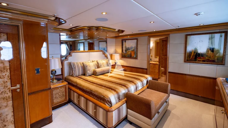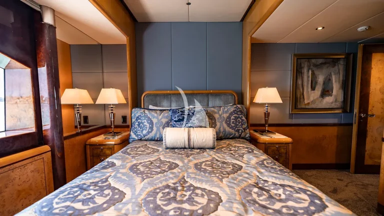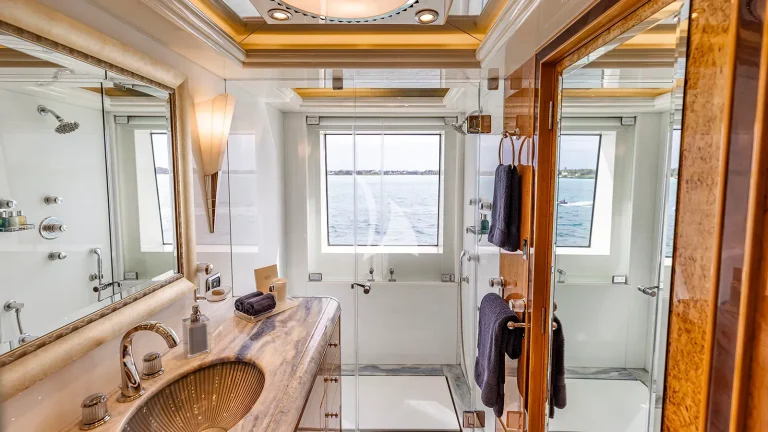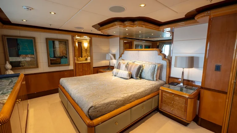Accommodations are tailored to suit families or groups with ease, sleeping up to 12 guests across six beautifully appointed staterooms. The full-beam master suite, located forward on the main deck, is accessed through a private office and foyer and includes his-and-hers ensuites, a walk-in cedar closet, and elegant lounge space. On the bridge deck, a convertible guest stateroom features a hidden Murphy bed and ensuite, ideal as a massage room, gym, or children’s playroom depending on guest needs, an uncommon flexibility on yachts in this category. Below deck, four spacious king staterooms each offer privacy, ensuite bathrooms, and integrated entertainment systems.
