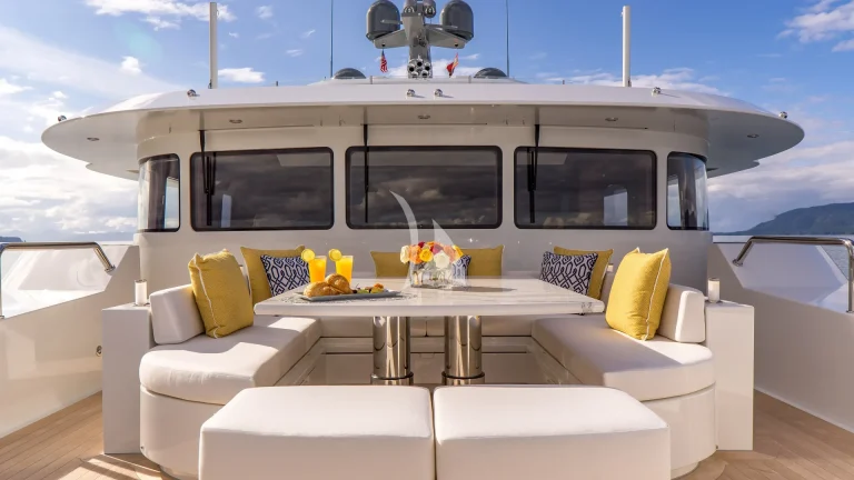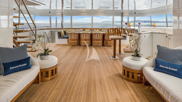 What truly sets ENDLESS SUMMER apart is her expansive exterior deck space, thoughtfully designed for alfresco dining, sun-drenched lounging, and unforgettable gatherings. Her exceptional sundeck features a Jacuzzi, full-service bar, and an outdoor cinema—perfect for starlit evenings at sea.