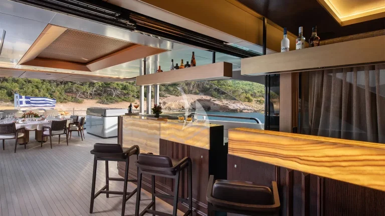 On the lower deck, the expansive beach club offers more than just access to the sea—it’s a lifestyle destination in itself. Equipped with stylish furniture and space for oceanfront dining, it’s perfect for sun-drenched lunches or cocktails at the water’s edge.