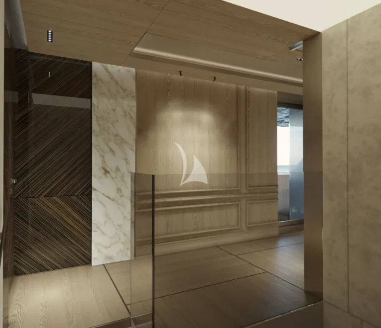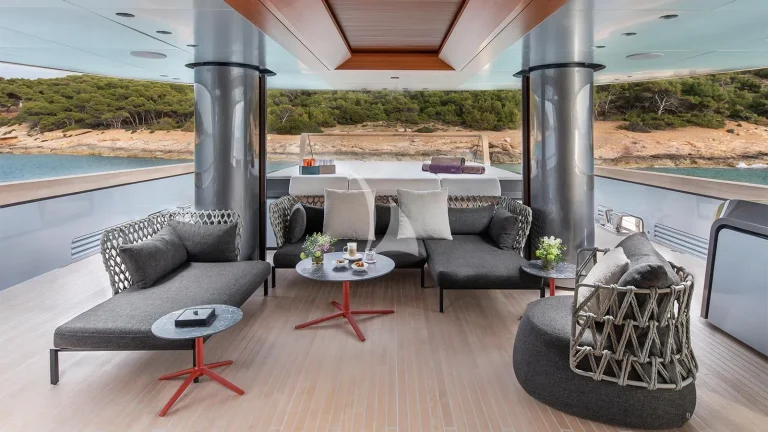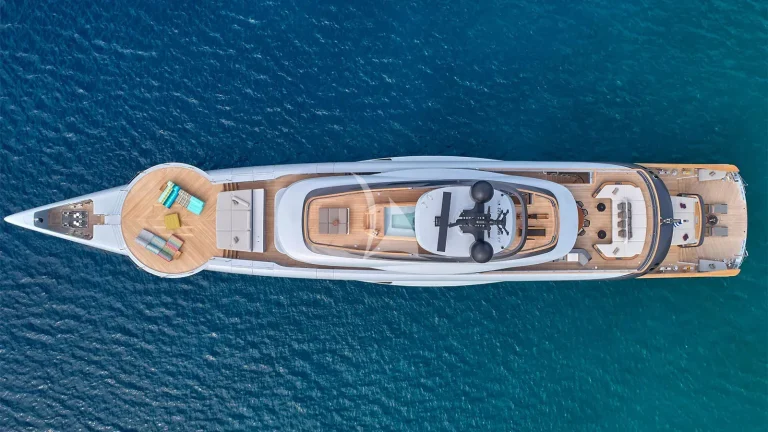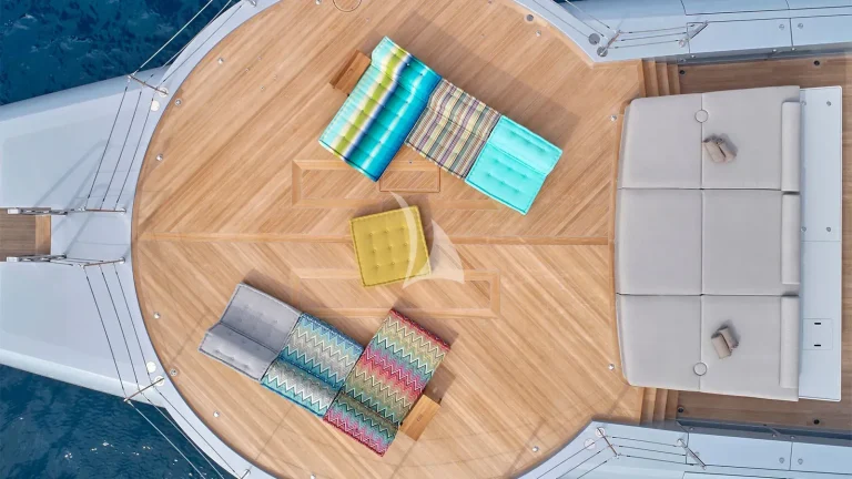 The sundeck is a haven for wellness and leisure, featuring a large swimming pool and an open-air gym with panoramic views. A Touch-and-Go helipad on the foredeck ensures discreet, effortless arrivals, while also doubling as a stylish gathering spot complete with sunpads, loungers, and a fire pit.