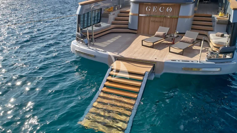 Blending sleek, modern lines with expansive windows that flood the interiors with natural light, GECO is a true masterpiece of contemporary yacht design. Her award-winning aesthetics are matched by generous volumes, stylish finishes, and multiple levels of indoor and outdoor living spaces that welcome up to 12 lucky guests in absolute comfort.