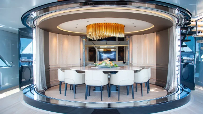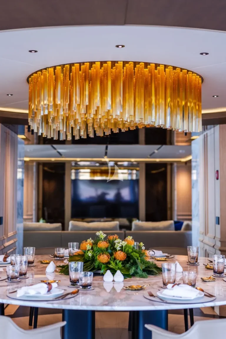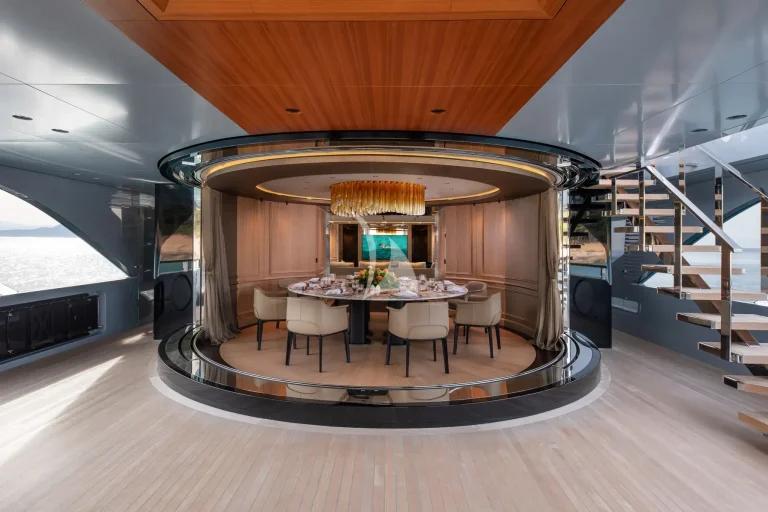 The yacht’s serene ambiance is achieved through a rich blend of luxurious materials (leathers, light woods, marble, and hardwood floors) complemented by striking modern art pieces. The main salon offers lounge seating and a full entertainment system, while a private dining room with a circular table and statement chandelier provides a refined setting for shared meals. Upstairs, a second salon links directly to the Buddha Bar, ideal for casual evenings and relaxed socializing.