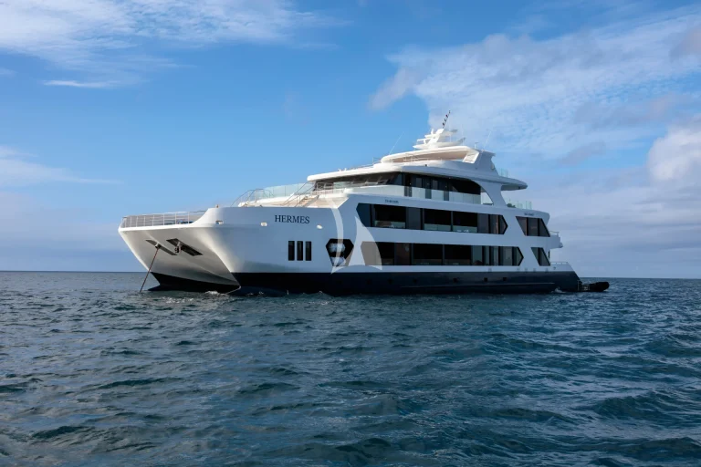 HERMES is an ultra-luxury catamaran, the first of its kind in the Galapagos Islands, crafted to deliver unmatched exclusivity and comfort for up to 20 guests. With a nearly 1:1 crew-to-guest ratio, each suite offers a private balcony with breathtaking views of the Galapagos, ensuring a personalized and intimate experience. The yacht’s contemporary design includes two sophisticated lounges, a library featuring an array of books on Galapagos wildlife, and a spa complete with a Hammam. Outside, the expansive deck space invites you to dine alfresco, unwind in a large Jacuzzi with sunbeds, or relax in the sundeck’s forward observation seating, ideal for soaking in the mesmerizing landscape, while the upper deck aft is perfect for enjoying evening aperitifs.
