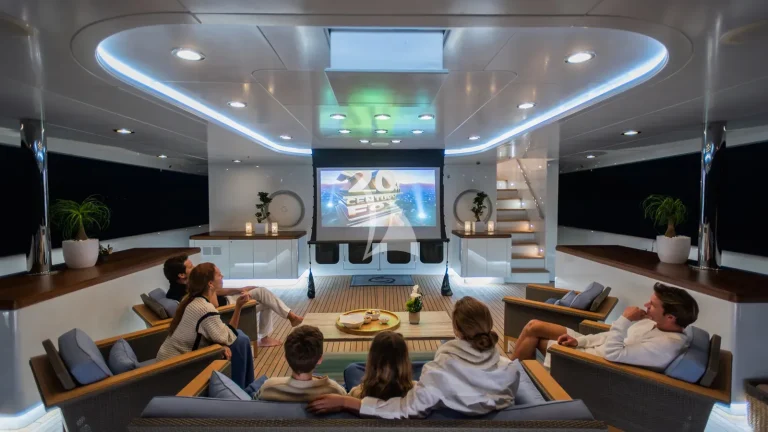 Outdoor living setups have been maximised, with spaces including the huge sun deck featuring a bar, spa pool, BBQ, gym equipment, and sun loungers. The main aft deck is a popular spot that has been styled around a Nikki Beach feel, with modular Paolo Lenti furniture that can be rearranged into configurations including one huge seating area, sheer curtains for privacy, and an outdoor cinema setup.
