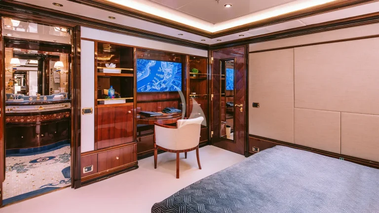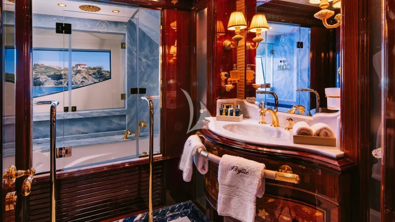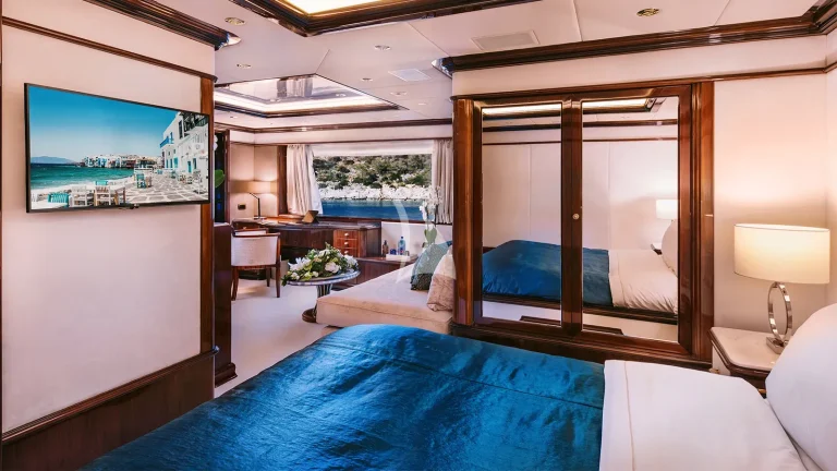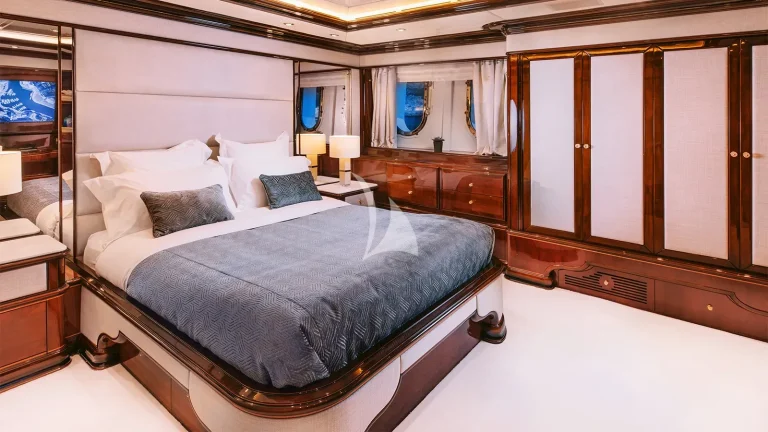 IDYLLIC sleeps 12 guests in six beautifully appointed cabins, including a remarkable split-level full-beam master suite located forward on the main deck. This signature suite offers a private sanctuary with soaring ceilings, panoramic views, a dedicated office space, and direct access to the bow deck, ideal for quiet moments or morning coffee in solitude. A lavish VIP suite on the upper deck features a king-sized bed, private lounge, and dressing room, while the lower deck houses four additional double guest cabins, all with en suite bathrooms, ensuring every guest enjoys privacy and tranquility.