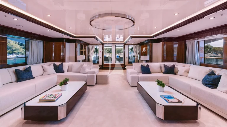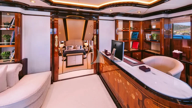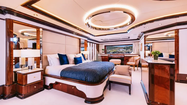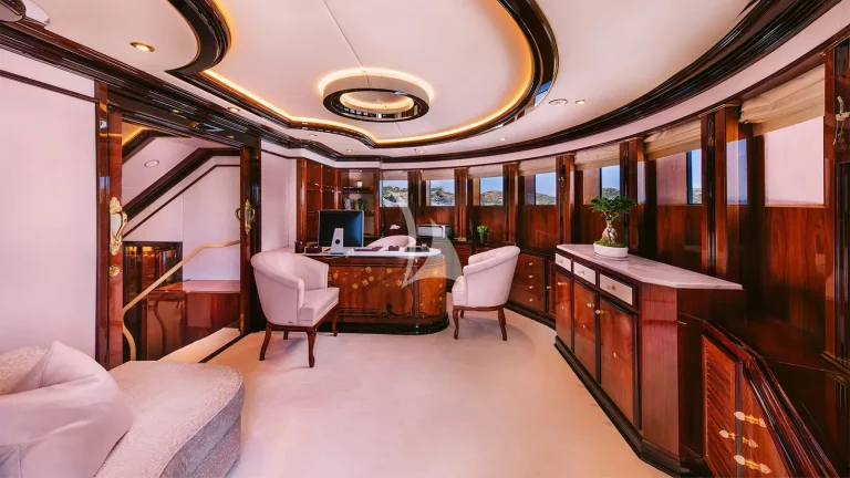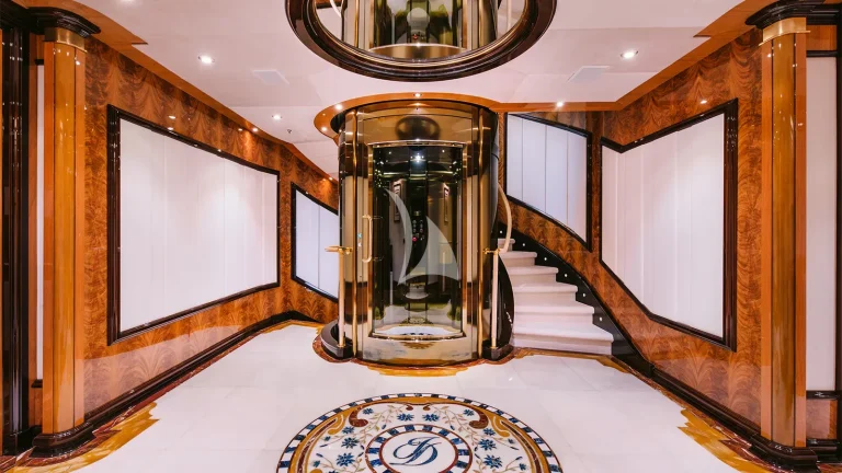 The yacht’s expansive sun deck is a focal point for leisure and socializing, featuring an inviting Jacuzzi, a fully stocked cocktail bar, and an array of oversized sun loungers. Whether relaxing under the Mediterranean sun or enjoying cocktails at golden hour, this area creates a refined yet relaxed vibe akin to a private beach club. An elevator connects all guest decks, allowing for effortless movement throughout the yacht and easy access to every space, from the sky deck to the waterline.