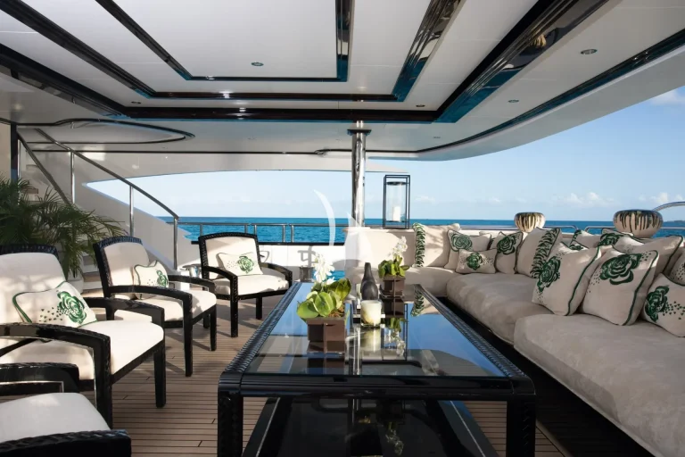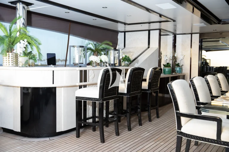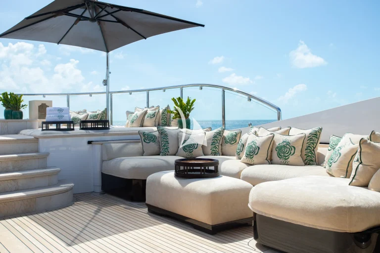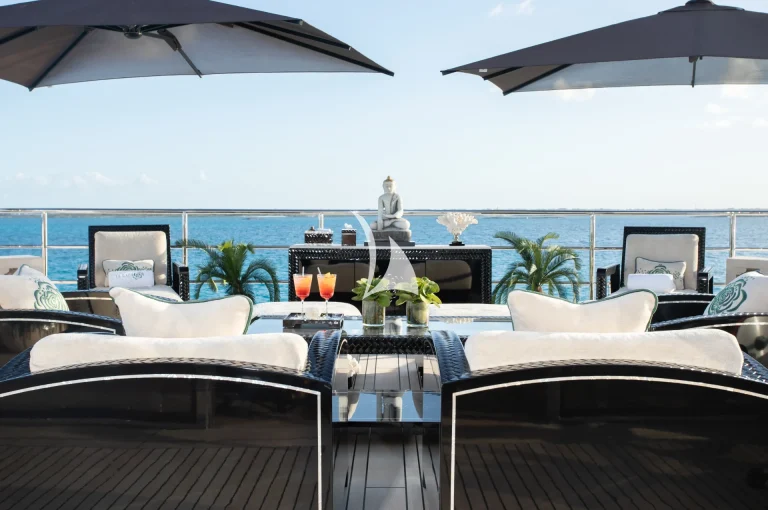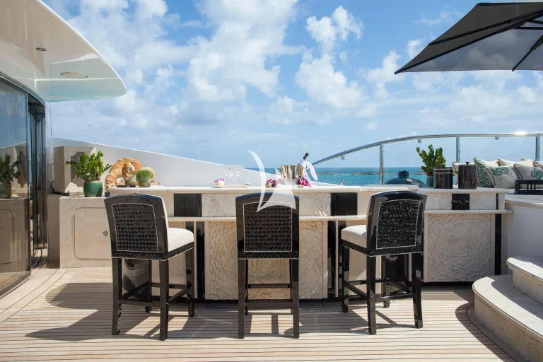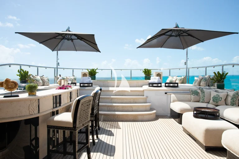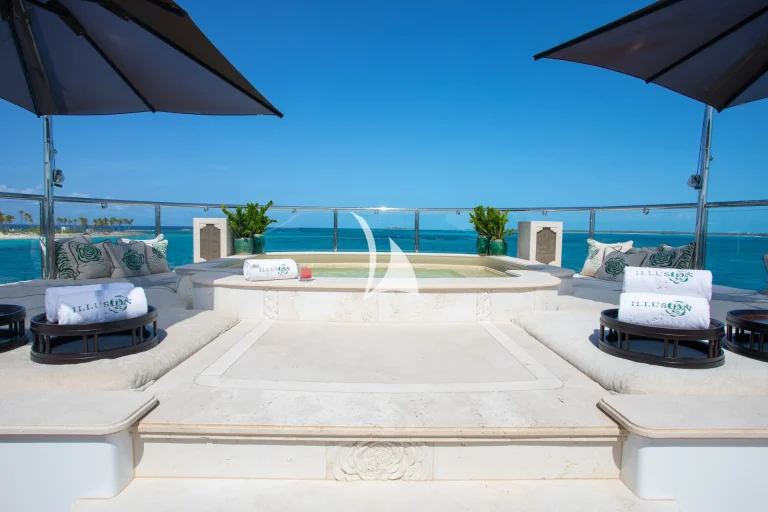 Up on deck, her spaces have been carefully planned for optimum privacy and comfort. Her sun deck is perfectly setup for ‘at sea’ entertaining and houses a large Jacuzzi, which is surrounded by sunpads, loungers, bar and barbecue. With such a long list of artfully crafted features – as well as an incomparable selection of water toys comprising a Jetsurf board, a Snuba and Scuba gear, fishing equipment and inflatables – there is no arguing Illusion V offers the finest in barefoot luxury.