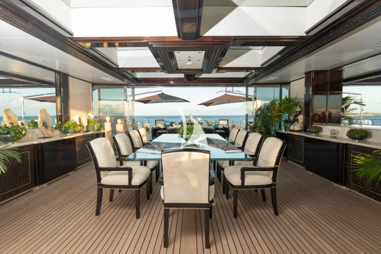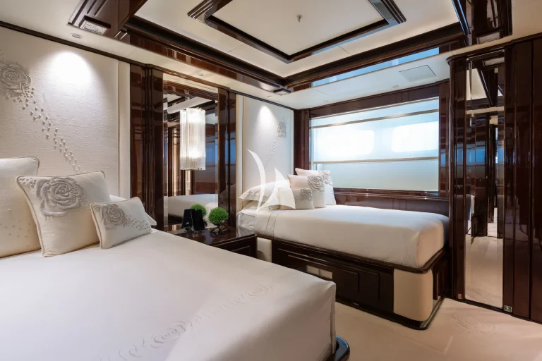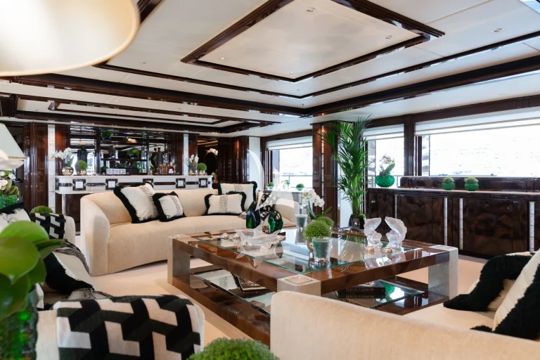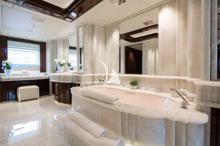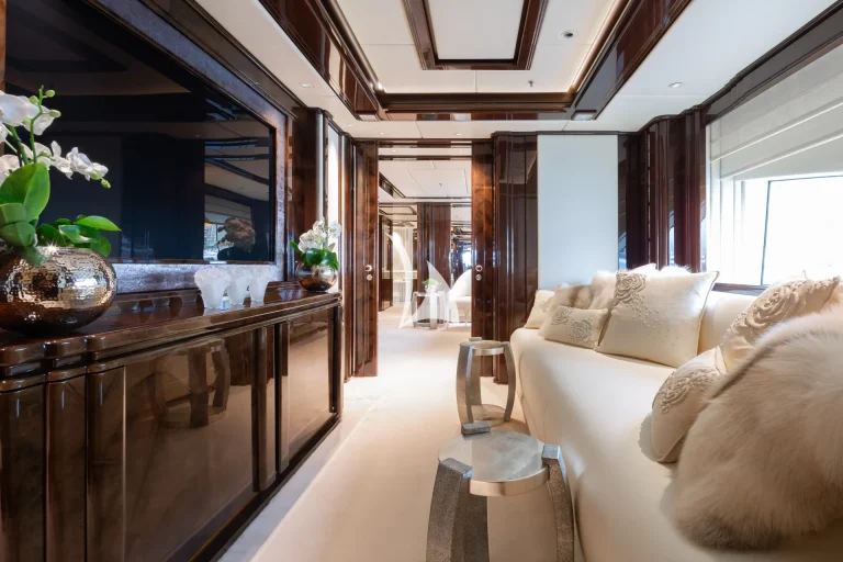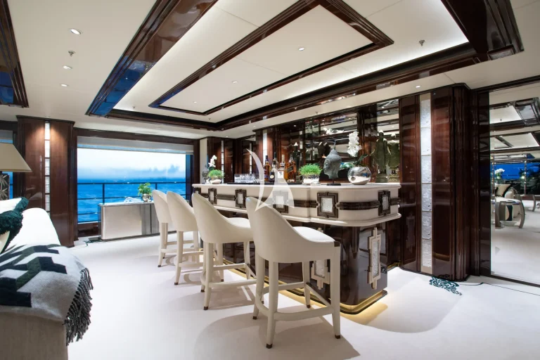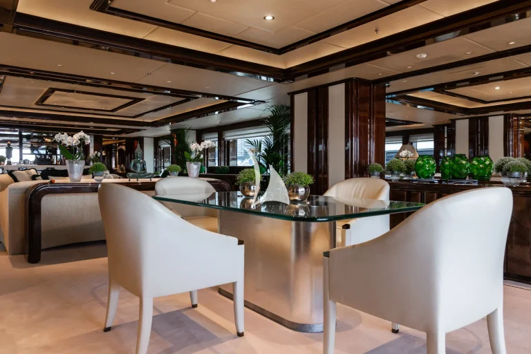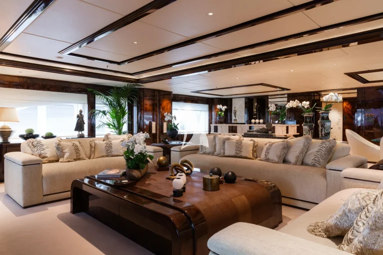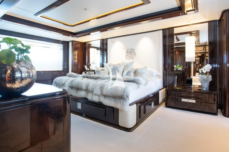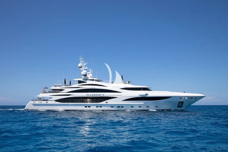 Designed to represent the epitome of elegance, Illusion V’s contemporary interior incorporates exotic materials such as walnut, onyx, Lalique crystal, parchment and silks, all of which create an inviting backdrop to the stunning vistas viewed from the full height windows. Boasting a massive master suite with study, full-width VIP stateroom and four large additional staterooms, she comfortably accommodates up to 12 guests. What’s more, she has an abundance of dining, entertainment and relaxation areas, a full bar and beach area on her lower deck, and the latest technology in stability and noise reduction.