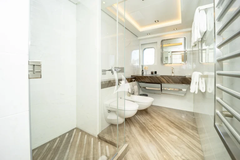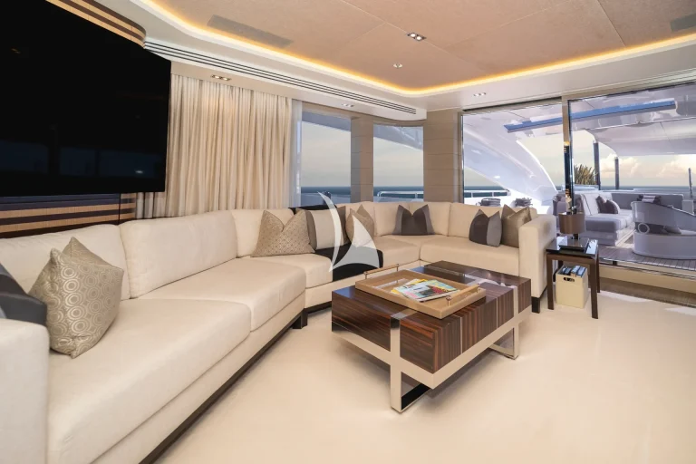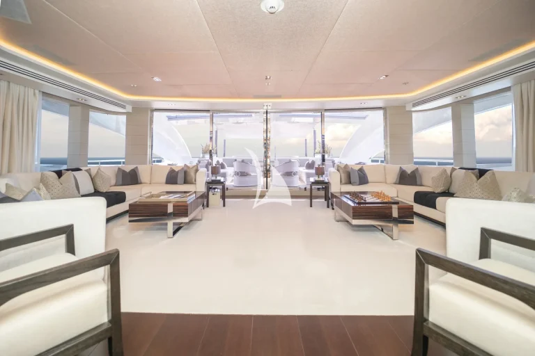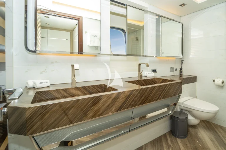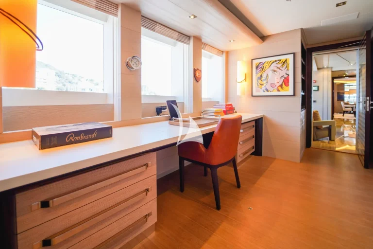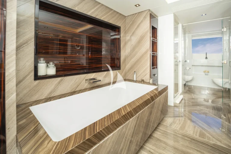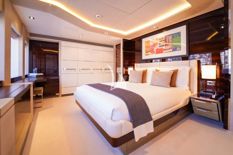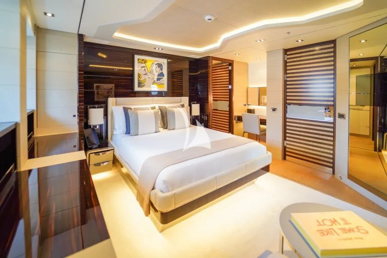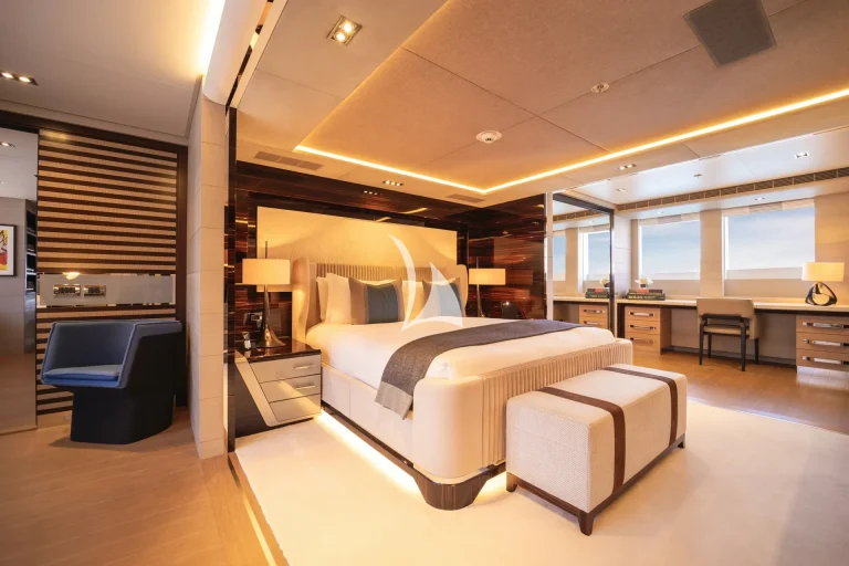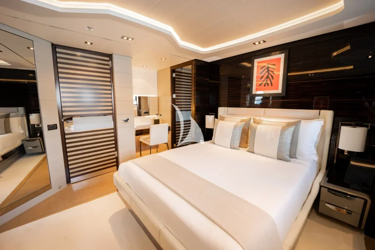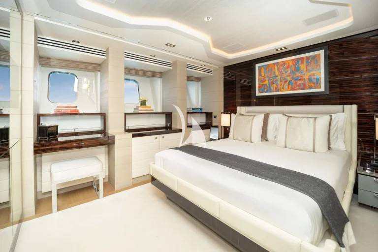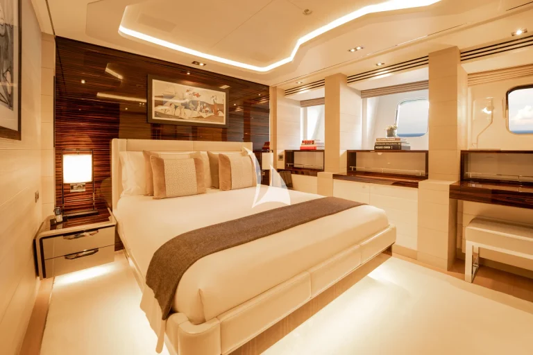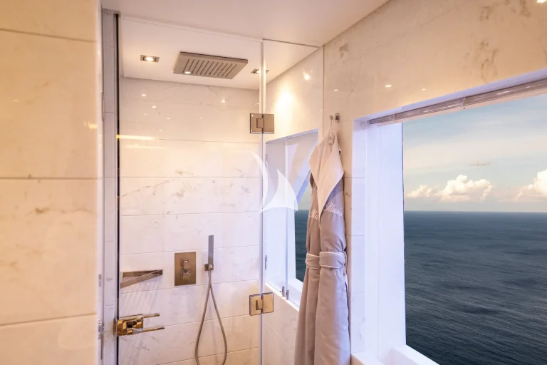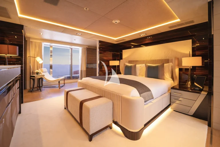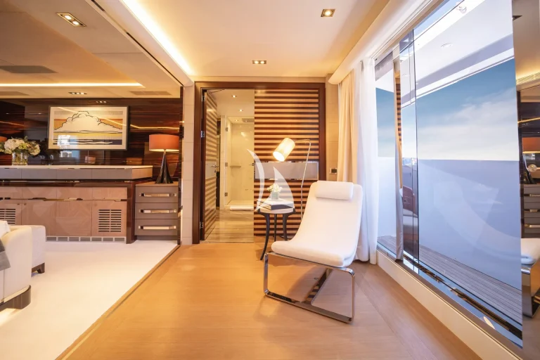 She welcomes 12 guests in six double cabins, a full-beam master suite on the main deck with study and full-height glass sliding doors opening onto a private breakfast balcony to starboard, a VIP suite on the bridge deck and four lower deck double cabins.