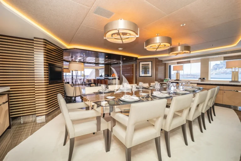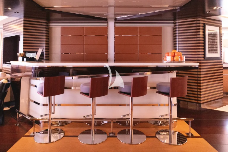 Inside, the grand polished steel and leather staircase encircled by walls lined with macassar links the main deck’s sophisticated bar and striking formal dining room with the bridge deck’s intimate sky lounge and bar.