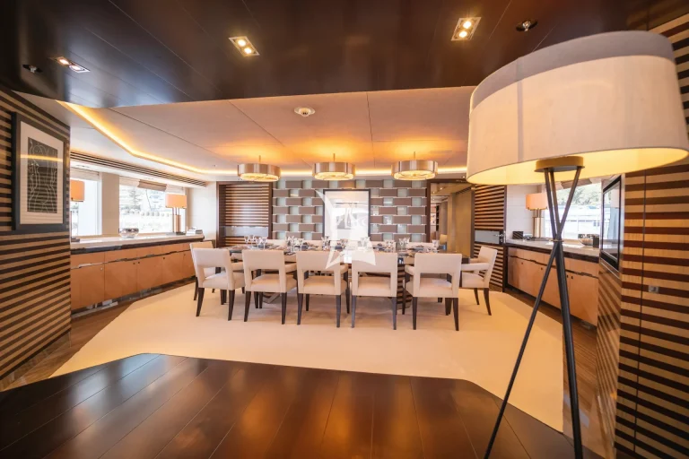 As popular as the sun deck undoubtedly is, the real star of this spectacular show is the spacious air-conditioned beach club with fully equipped bar, sauna, cold plunge pool, day head and shower. A 22sqm (237sqft) fold-out swimming platform and a 10sqm (108sqft) drop-down sea terrace to port, bring guests a genuine sense of the outdoors enhanced by the natural light shimmering through the glass-bottomed pool on the main deck aft. It’s a stunning space. With additional lounging, sunbathing, and nine other dining areas on the foredeck, bridge deck and main deck, she has abundant options for social and intimate al fresco relaxation, fun and entertainment.