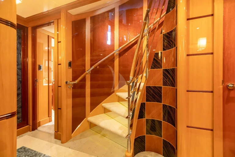 The main salon features an open-plan layout with generous seating and a dining area for 12 guests. A beautiful spiral staircase houses a dedicated wine cellar, adding a touch of sophistication. A raised conversation area on the main aft deck provides cool air conditioning and comfortable seating. Dual staircases lead to a large swim platform and a tender/toy garage. Those with a taste for adventure will appreciate IMPROMPTU’s seemingly bottomless toy chest of exciting watersports toys and inflatables.
