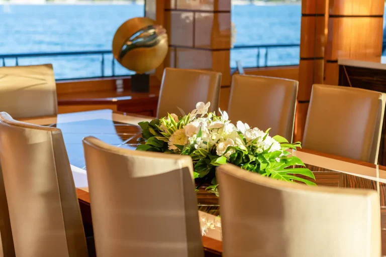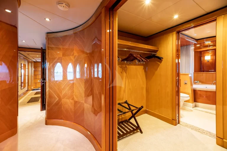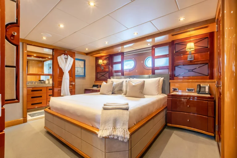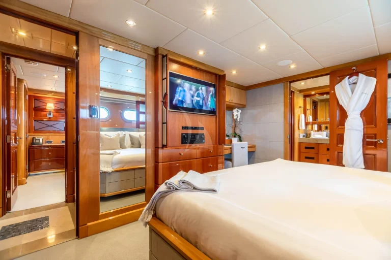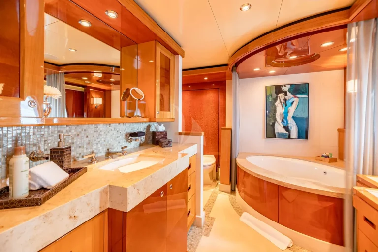 IMPROMPTU accommodates 12 guests in six stunning staterooms. The split-level master stateroom features a king-size bed, an elevated lounge with 180-degree views, and his-and-hers en-suite bathrooms featuring a steam shower, Jacuzzi tub, vanity and walk-in closet adjacent. A private study with a desk is located at the entrance. The bridge deck offers a VIP stateroom surrounded by large windows. On the lower deck, you’ll find three king staterooms and a twin cabin with a Pullman, each with desk areas and shower en-suites. The charter yacht’s versatile accommodation layout makes her primed family-friendly voyages.