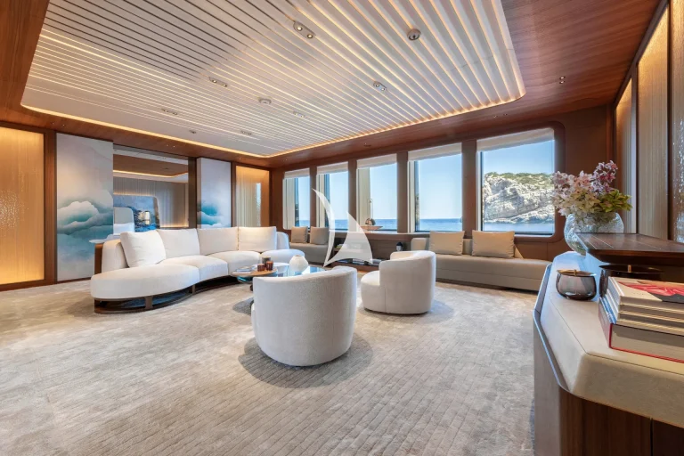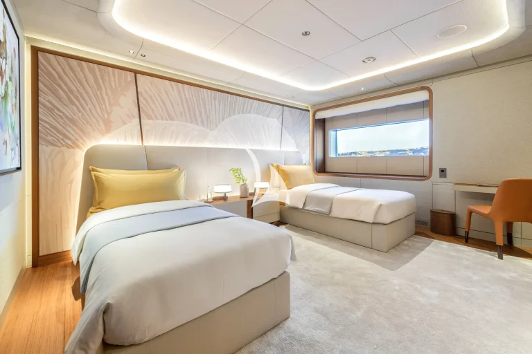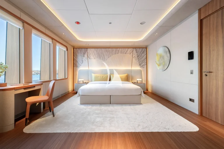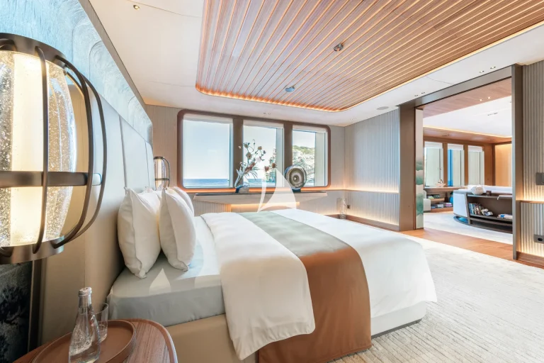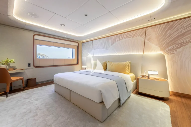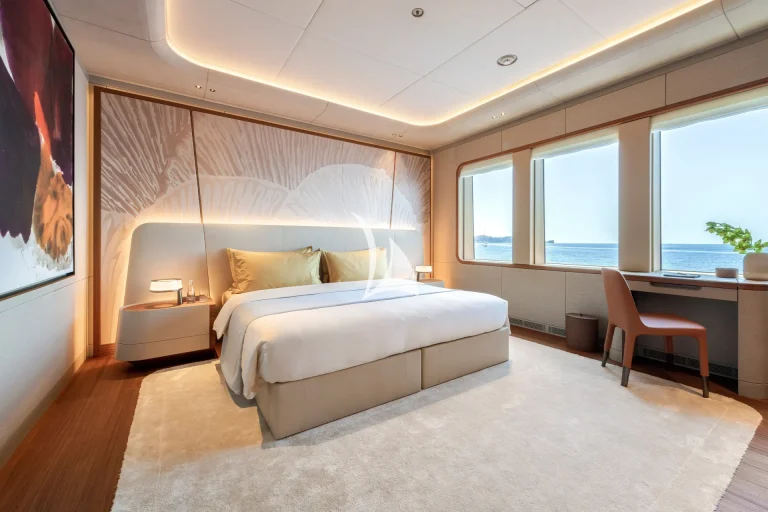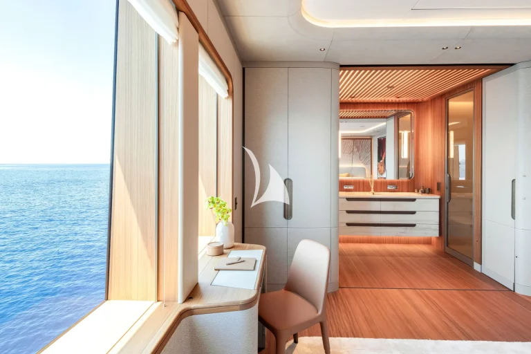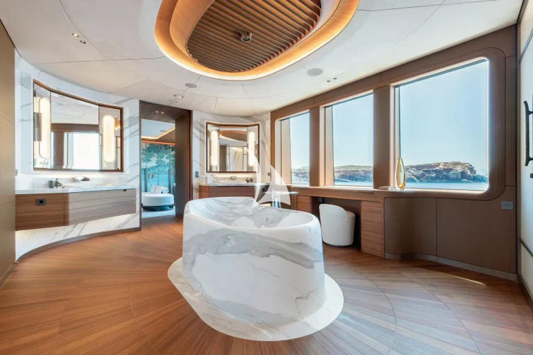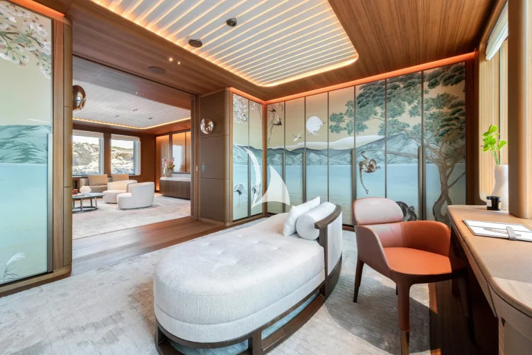 The Master suite is an on-the-water retreat, with four interconnecting rooms: a lounge/media room with curved sofa, bedroom, dressing room and bathroom with a central tub, all of which are inspired by Asian myth and modern craftsmanship. Loft-like volume and views to port and starboard through full length opening windows create a feeling of space and tranquility.