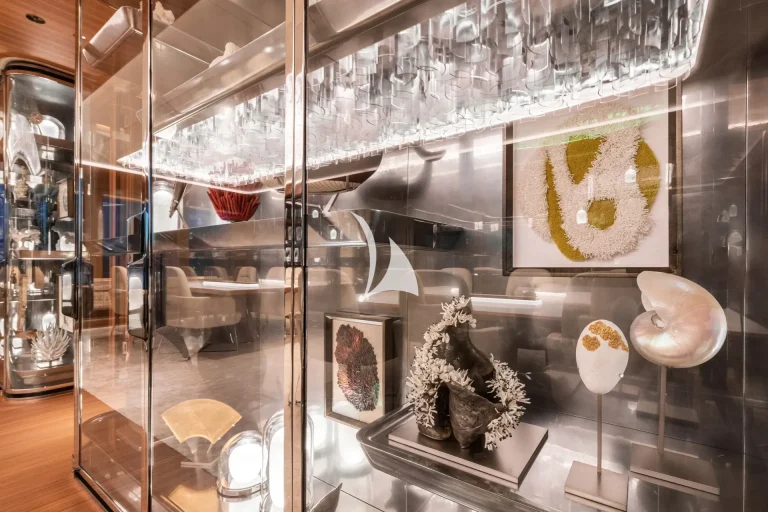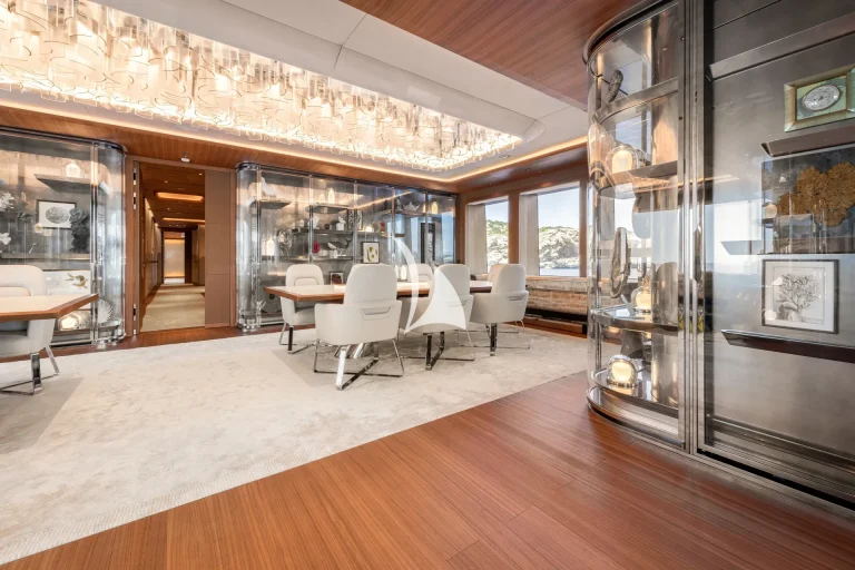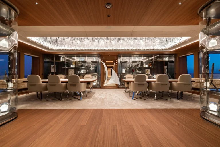 Kenshō’s exterior living spaces extend across four decks, from her sprawling swim deck with 6m glass-fronted pool on the lower deck, to the magnificent indoor-outdoor sun deck crowned by a unique skylight on the top. From fitness to relaxation or entertaining, guests’ needs are met by a variety of different areas, including a state-of-the-art gym on the swim deck, a secluded forward lounging area on the bow, a sheltered dining area on the upper deck and fully-equipped bar on the sun deck. The sun deck, also served by the elevator, is a spectacular space, with forward and aft zones that are connected by one of the yacht’s characteristic wide walkways. Glass windbreak doors can be shut, allowing total protection from the elements, or left open, allowing guests to enjoy the breeze – and uninterrupted views – through the centre of the yacht.