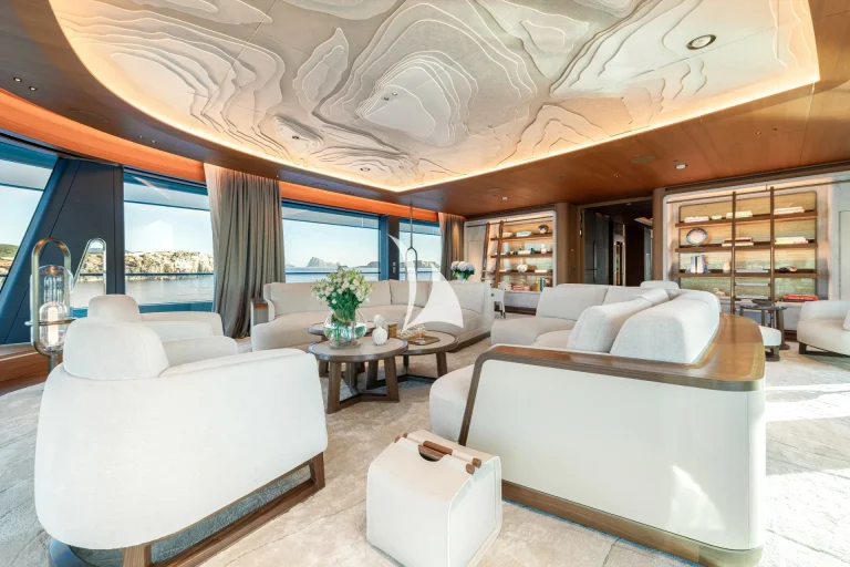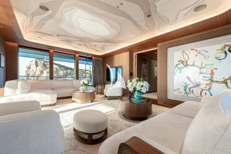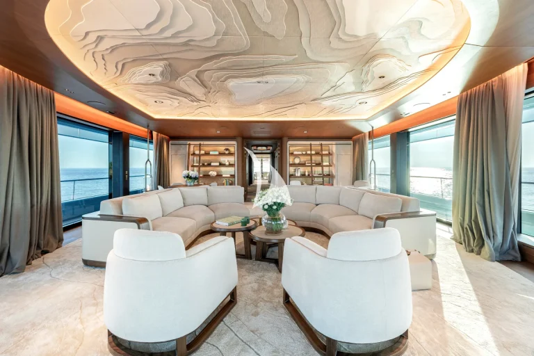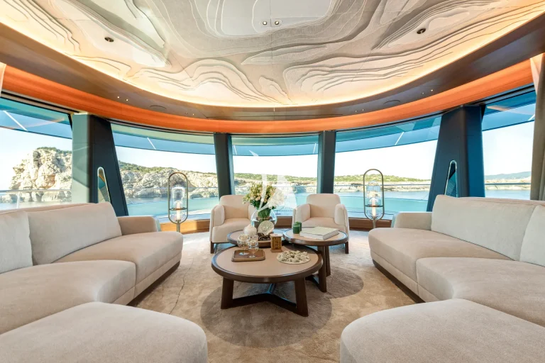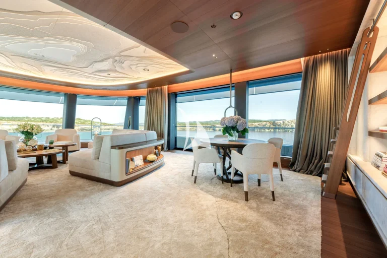 Designed not as a floating palace but as an at-sea retreat, the layout has been adapted to suit how the yacht will be used, with the main salon found not on the main deck as one might expect, but in a remarkable configuration of forward and aft living spaces on the upper deck, with spectacular forward views afforded through full length 180° windows.