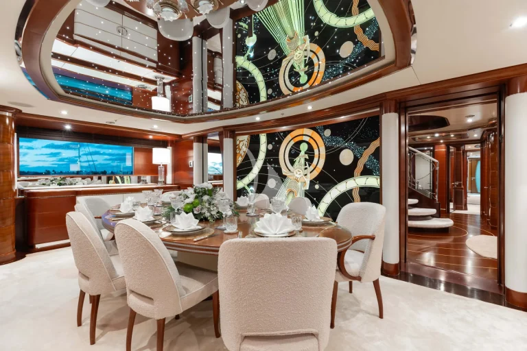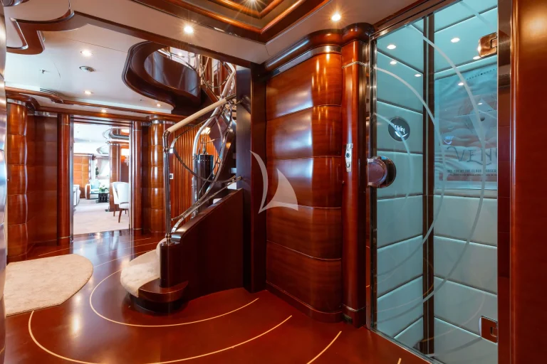 She also has a full-beam sky lounge, an indoor gym, a glass-paneled elevator, a beach club and one of the most impressive sundecks ever created for a yacht of this size.