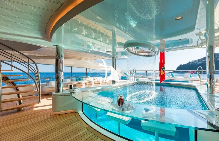 With so many standout features, including a floating IMAX cinema, it’s hard to pick just one or two. There’s the fully-certified helipad, the chic beach club with hammam and plunge pool, which sits beneath the large glass-bottomed swimming pool, and of course the nightclub.